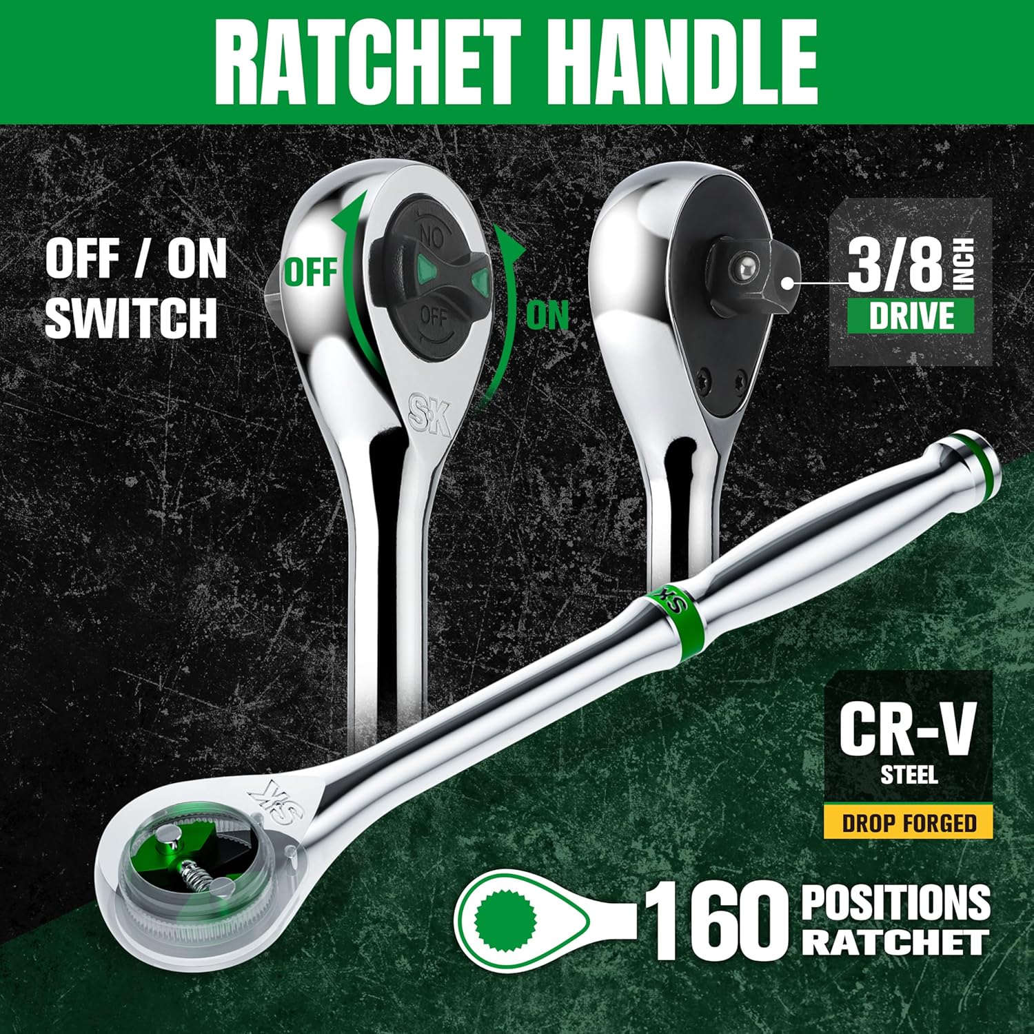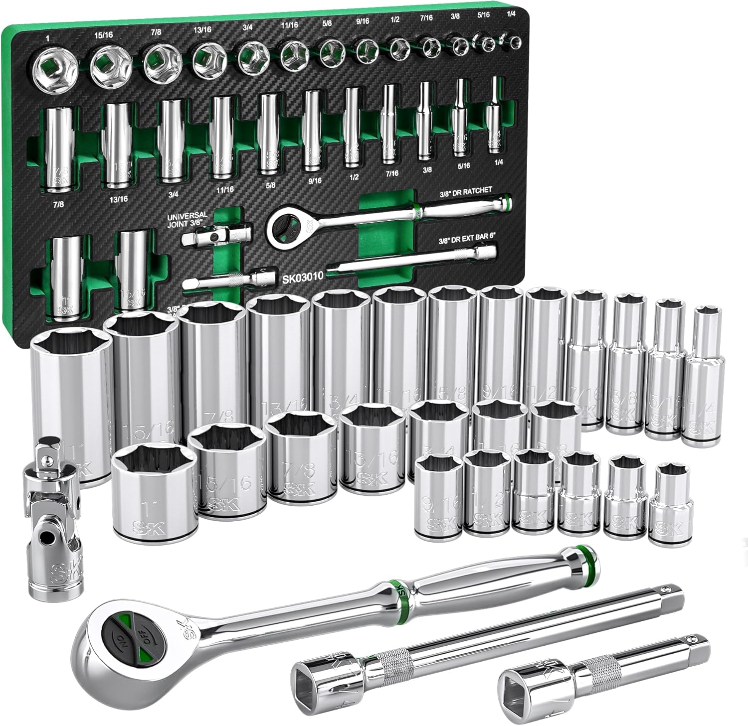 SK 3/8" Drive Socket Set with 160-P Ratchet, 56-Piece, SAE & Metric, SuperKrome Finish, Premium CR-V Construction, with EVA Foam Tool Organizer