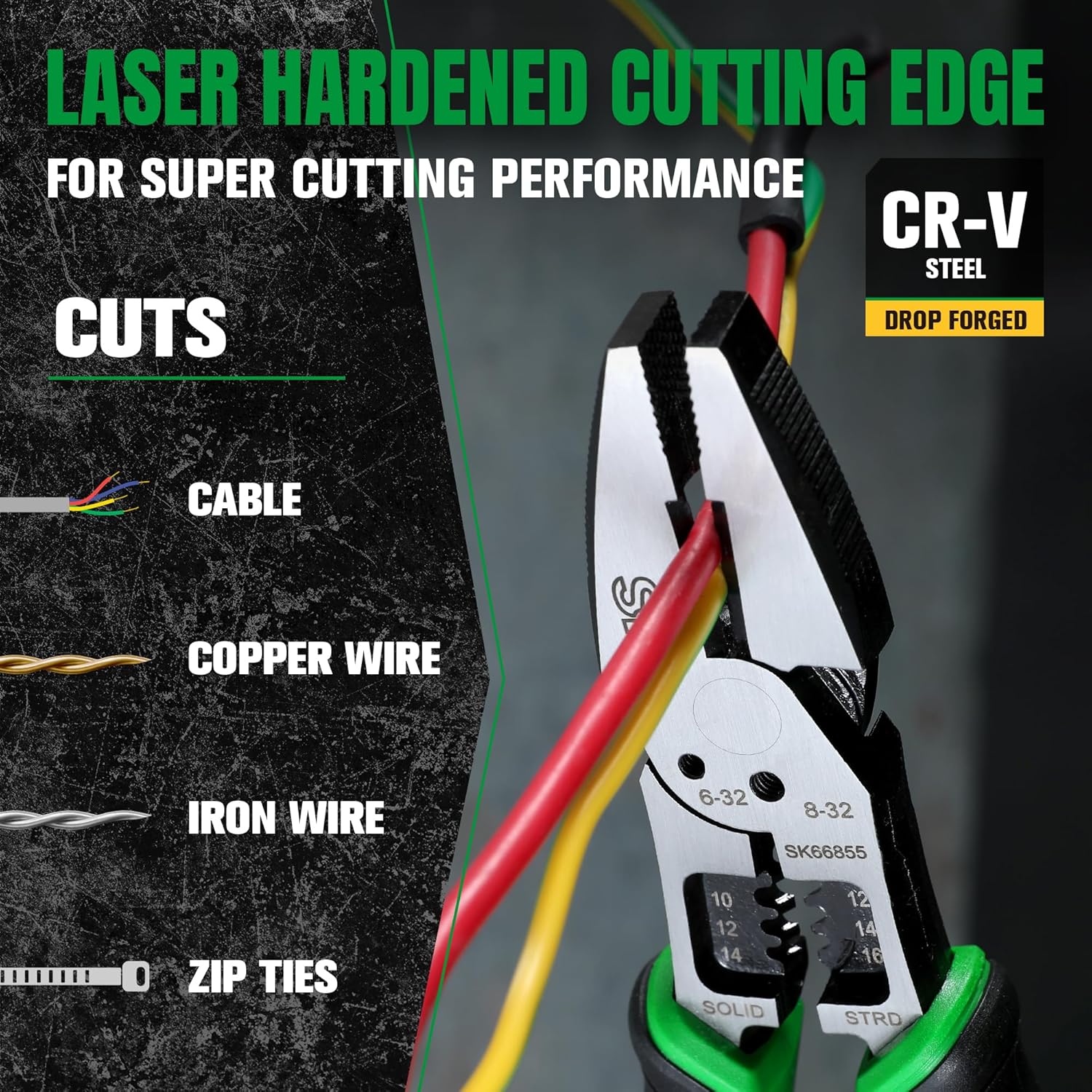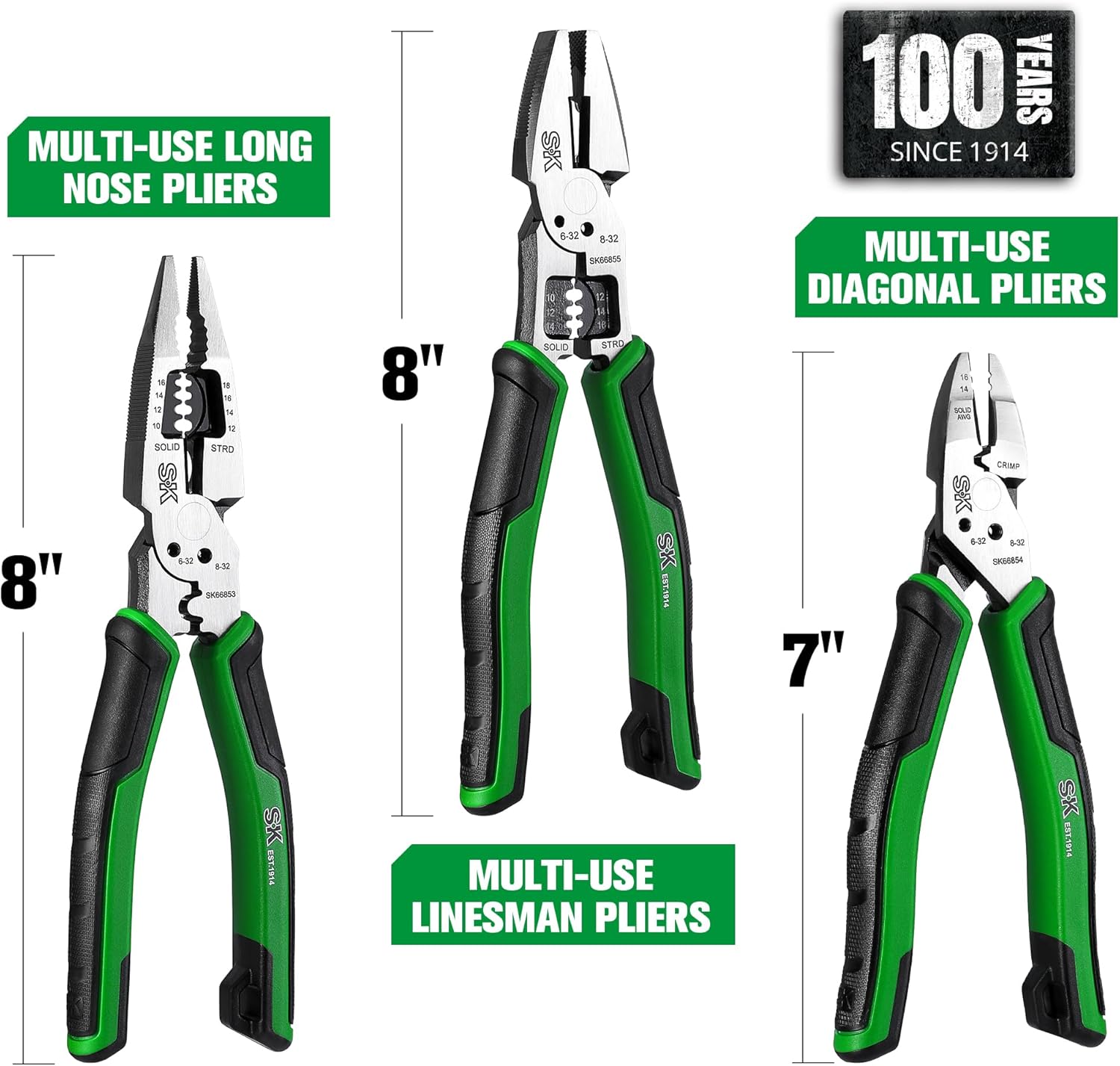 SK 3-Piece Pliers Set, 8-Inch Multi-use Noodle Nose Pliers, 7-Inch Multi-use Diagonal Pliers and 8-Inch Multi-use Linesman Pliers, CR-V Construction, Anti-slip Handle, with EVA Foam Tool Organizer