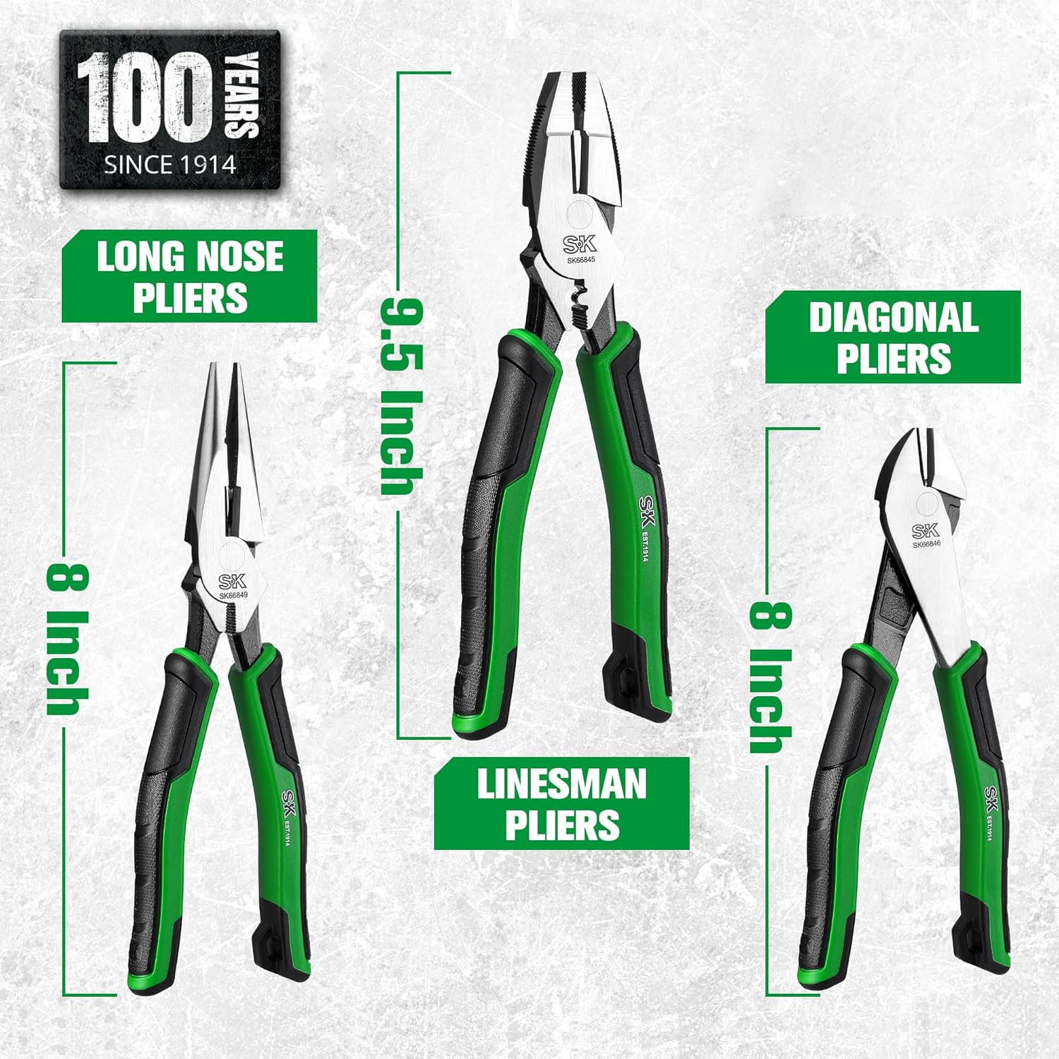 SK 3-Piece Pliers Set, 9.5-Inch Linesman, 8-Inch Diagonal & Needle Nose Pliers, Premium CR-V Construction, Ergonomic Anti-slip Handle, with Rolling Pouch