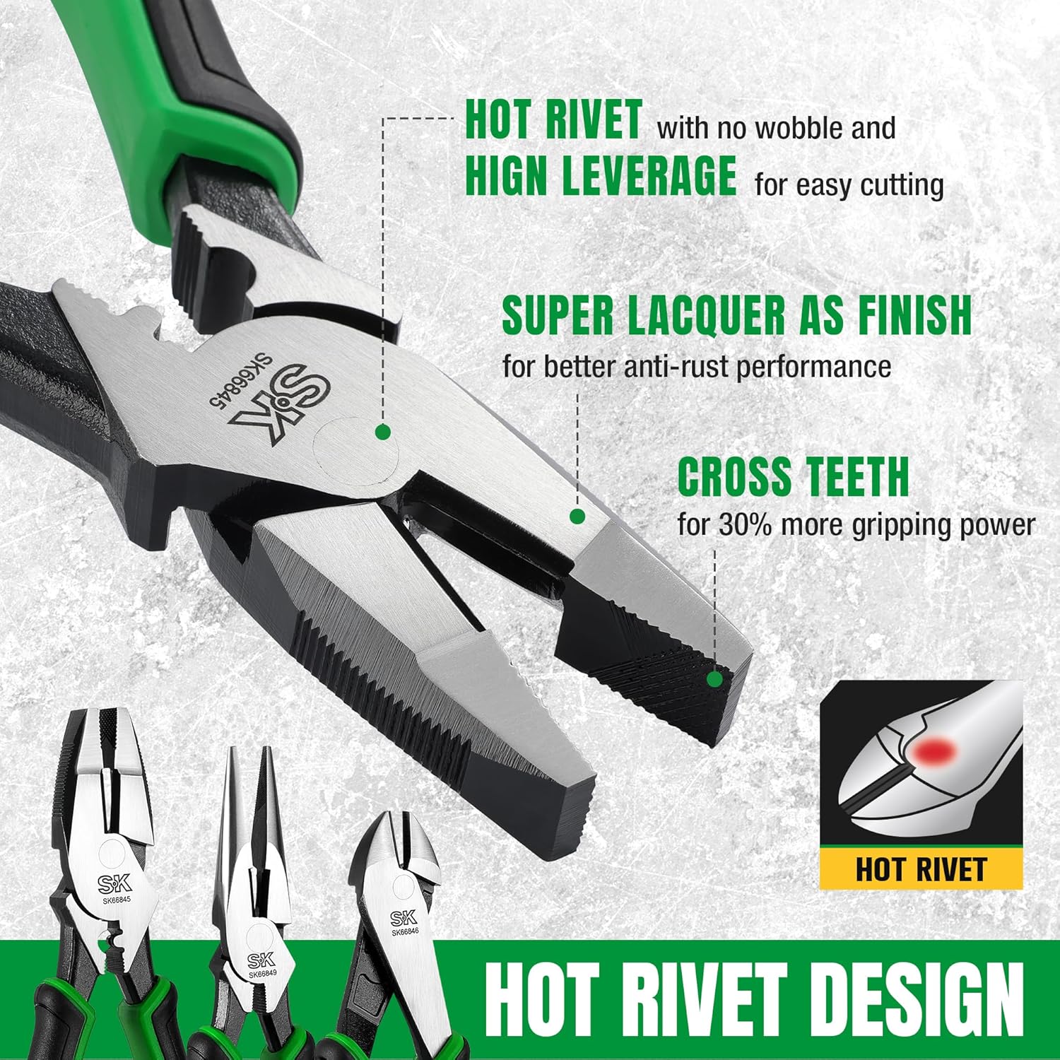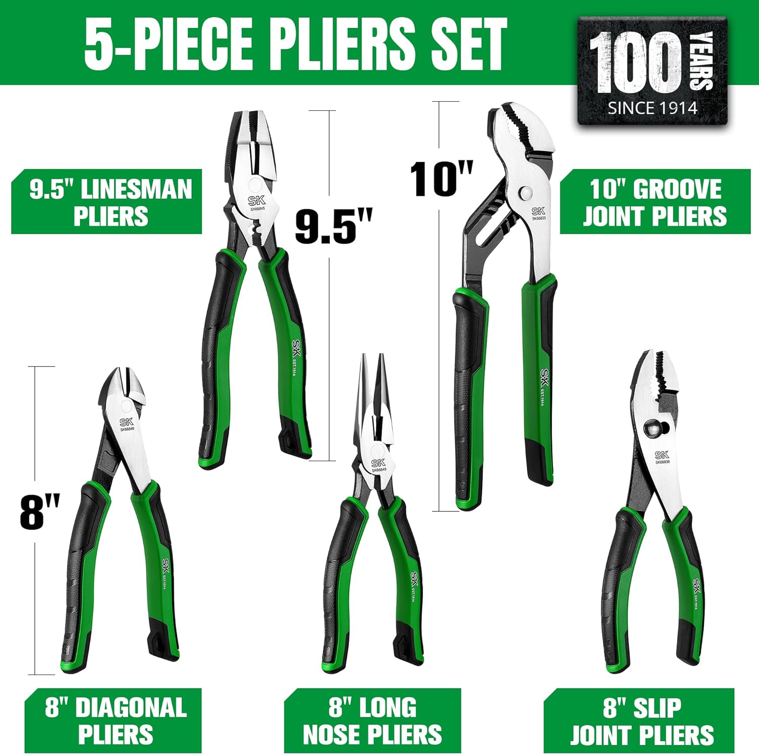 SK 5-Piece Pliers Set, 8" Long Nose, 9.5" Linesman, 8" Slip Joint, 8" Diagonal, and 10" Groove Joint, Premium CR-V Construction, with EVA Foam Tool Organizer