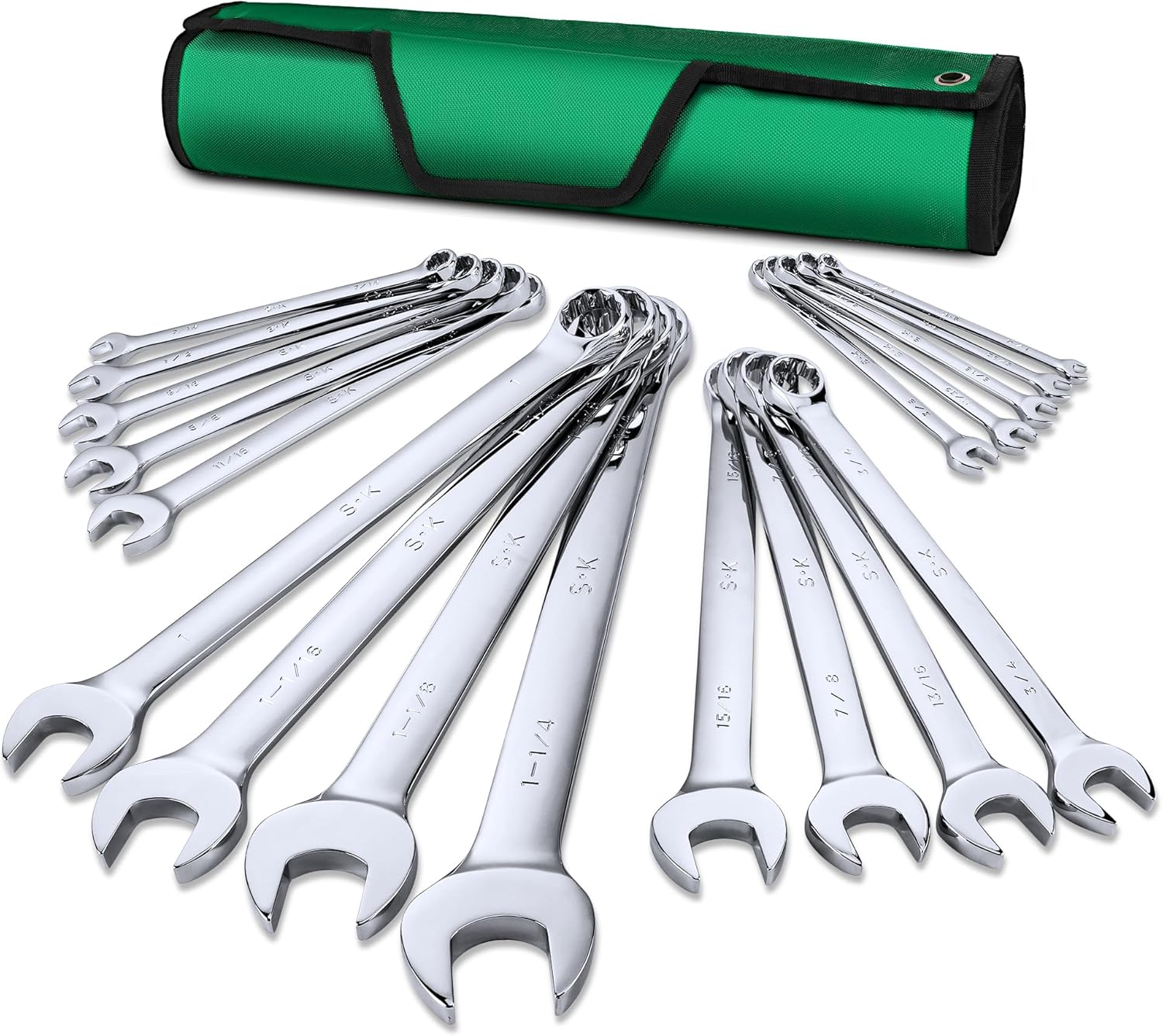 SK Combination Wrench Set, SAE 1/4" to 1-1/4", 18-Piece, SuperKrome Finish, Premium CR-V Construction, with Rolling Pouch