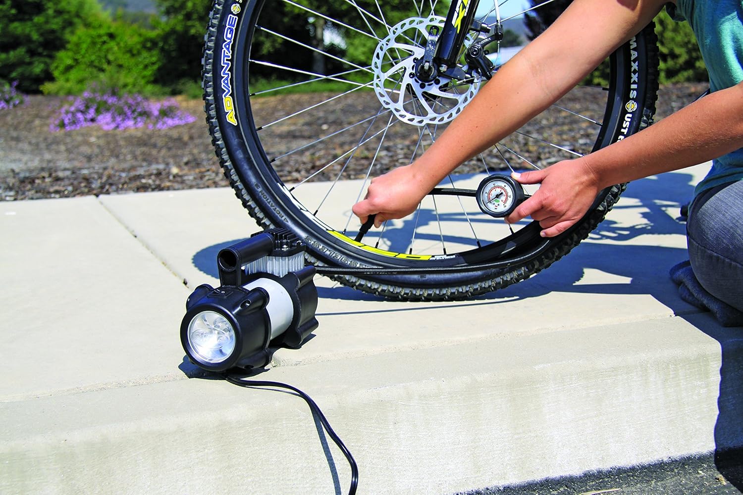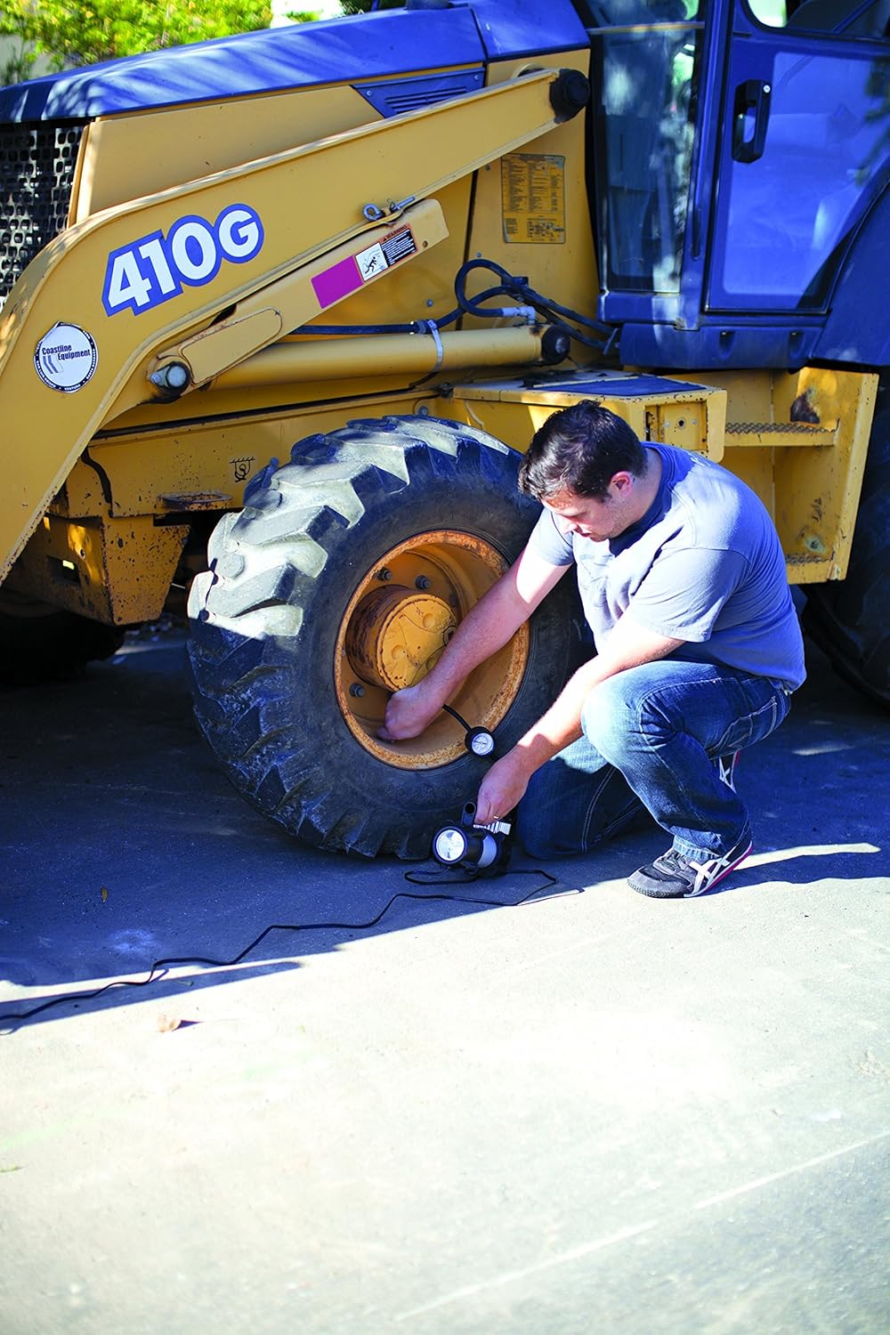 The heavy duty Pro Power Tire Inflator from Slime is ready for action. With a 3 minute inflation time for standard tires, a total reach of 27 feet, an integrated LED light, direct drive motor and in-line tire pressure gauge, it's ready to take on the world.