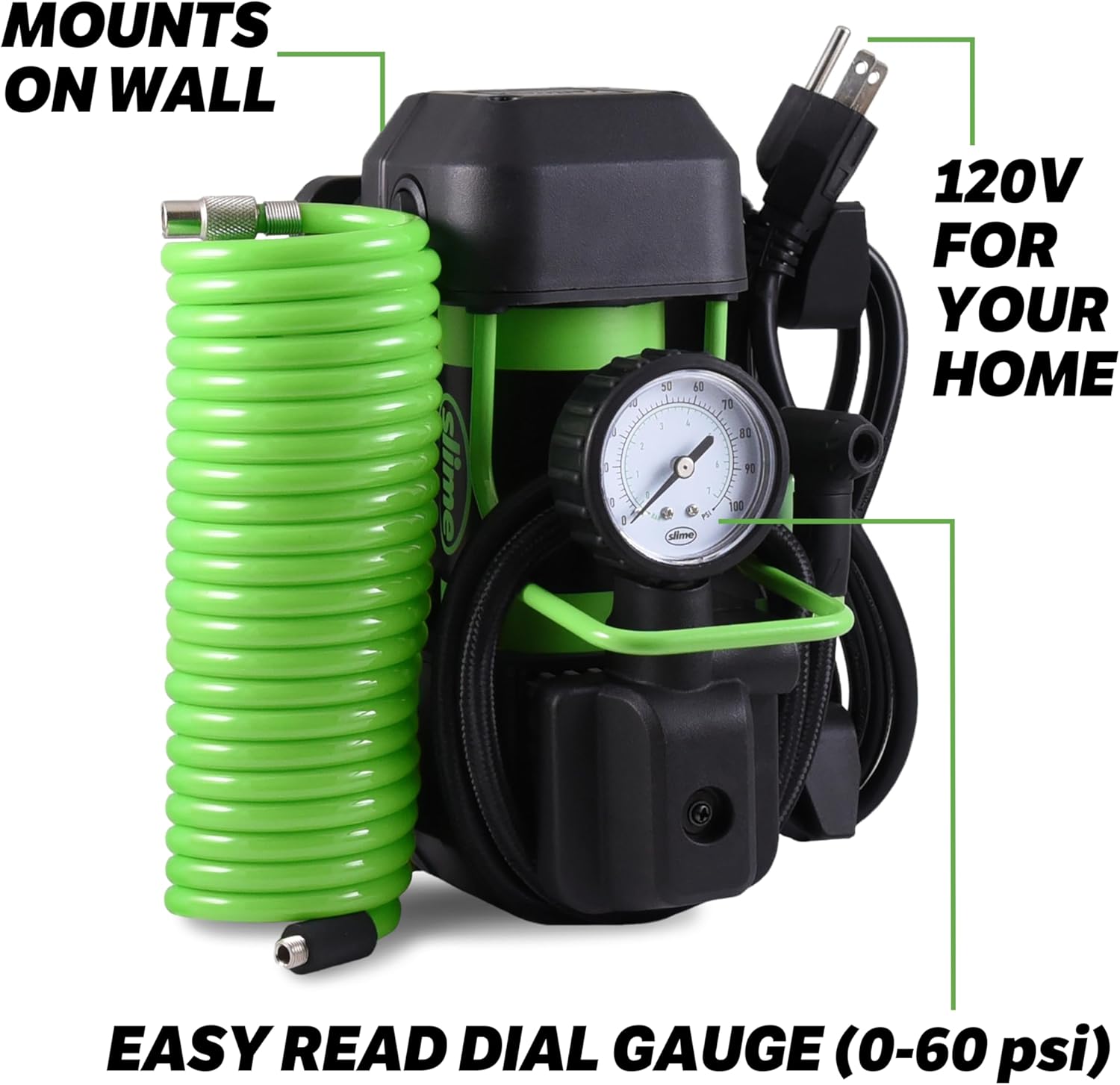 Slime 40045 Home Tire Inflator, Wall Mounted 120V, SUV, 4x4 Air Compressor, Heavy Duty, 2X Pro Power, with Analog 100 psi Dial Gauge, Long Hose and LED Light, 4 min Inflation