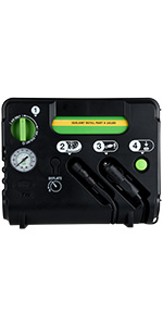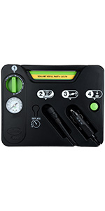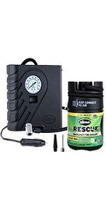Emergency tire repair complete kit: Tire inflator, 14oz (414 mL) sealant (refills available,) accessories for inflatables (sports balls), instructions, zipped storage bag