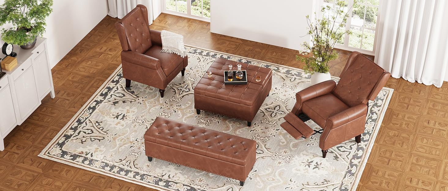 Small Recliner Chair, Modern Faux Leather Living Room Chairs with Tufted Buttons and Metal Rivets, Wingback Recliner with Wooden Legs, Comfy Pushback Arm Chair for Living Room, Bedroom, Matt Brown