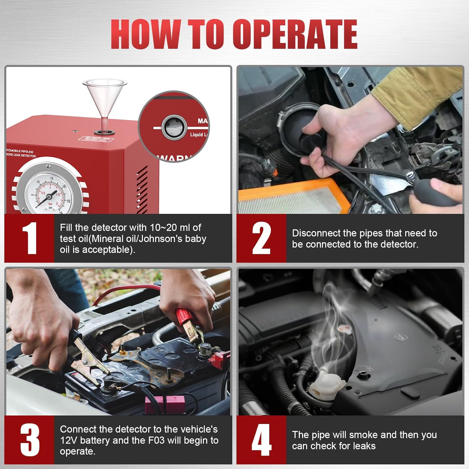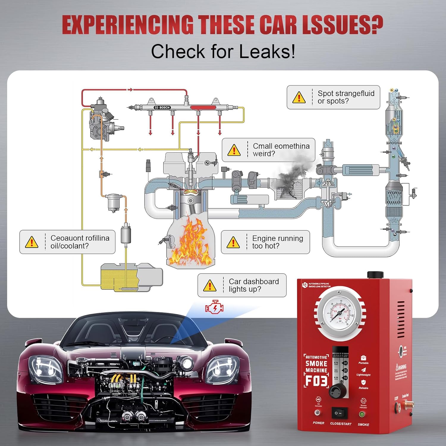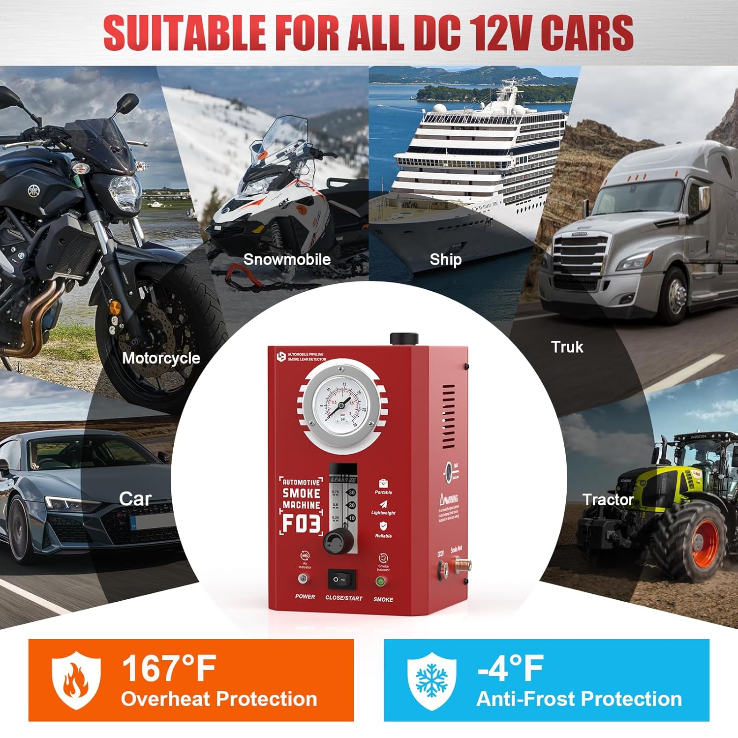 Smoke Machine Automotive with Flow Meter & Pressure Gauge, F03 EVAP Smoke Leak Detector Tester for Car & All 12V DC Vehicles in Vacuum - Fuel Diagnostic Pipe System, Built-in Air Pump (Oil Excluded)