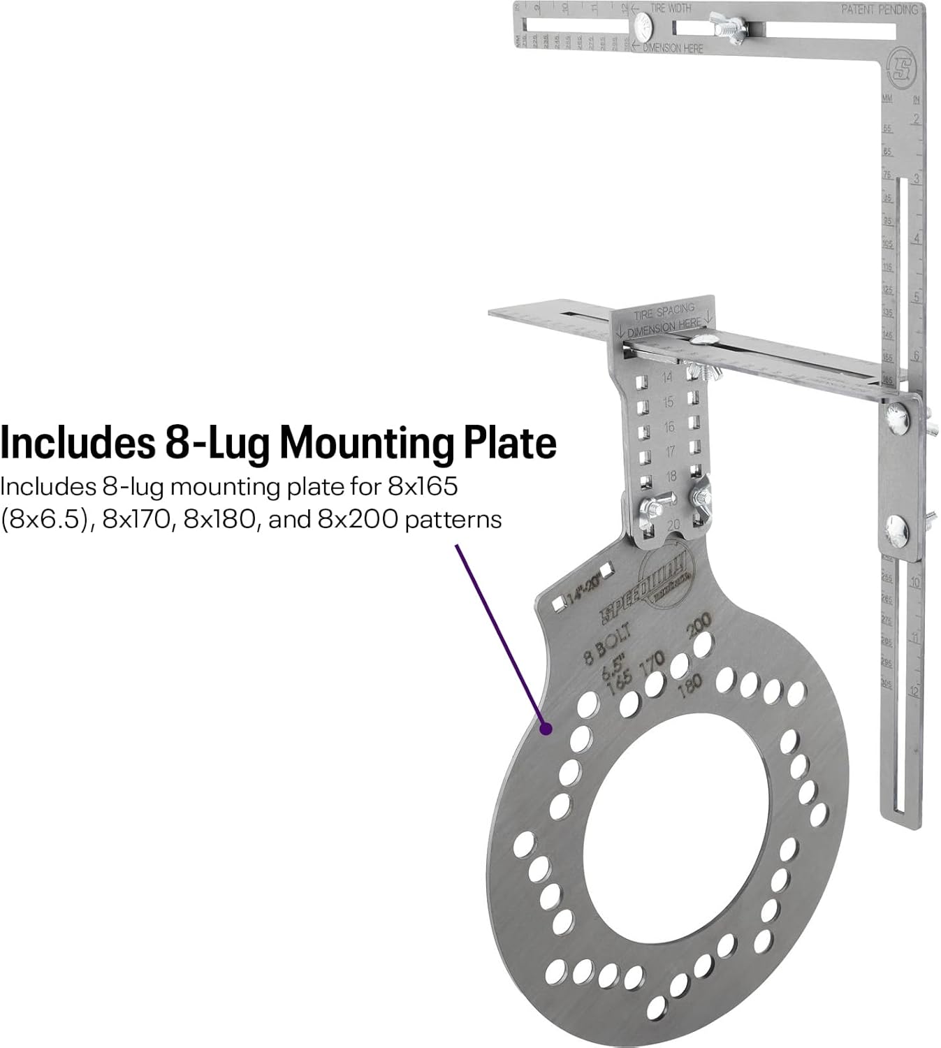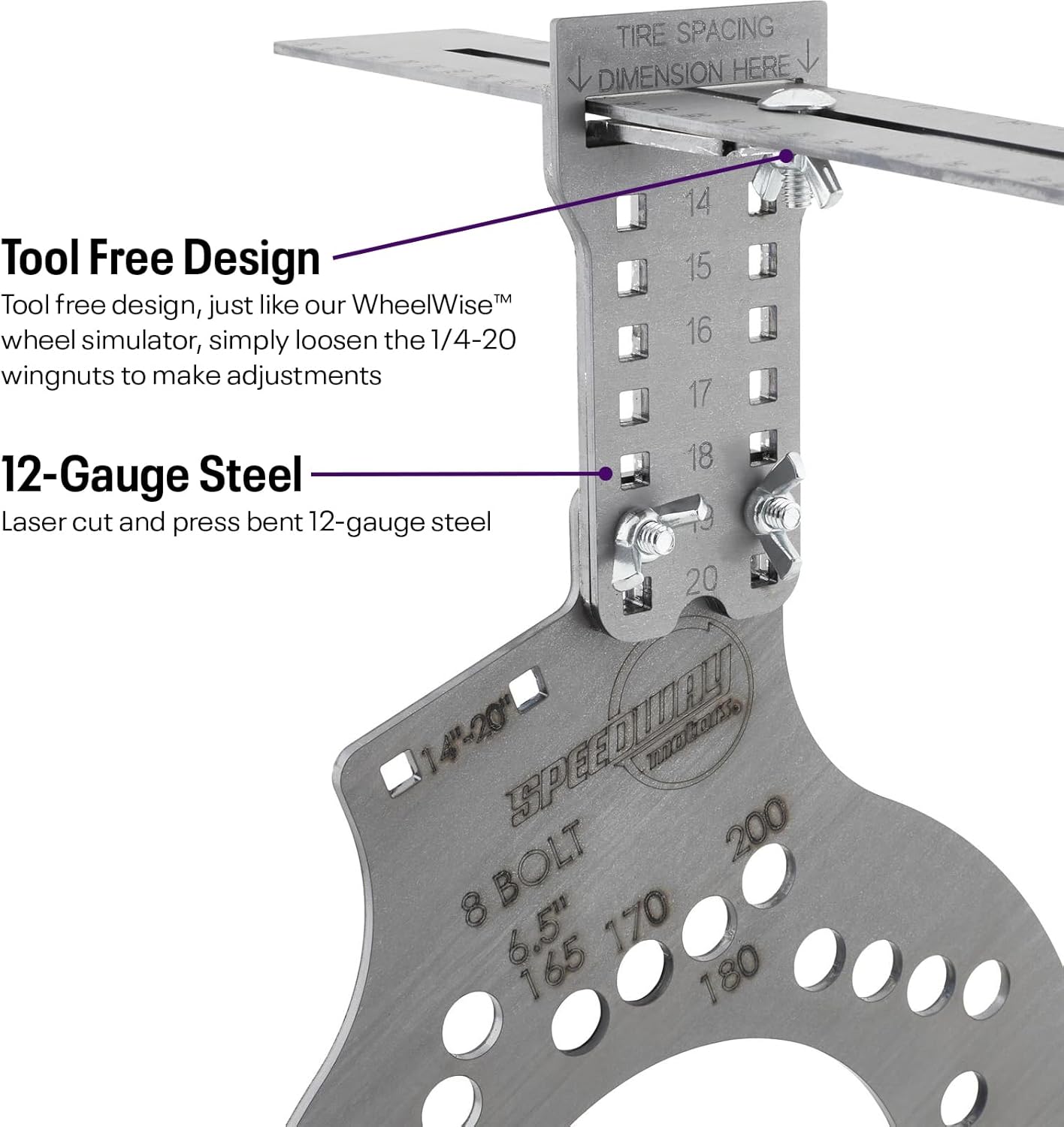 Speedway Motors WheelWise™ 8-Lug Wheel Fitment Tool with Tire Size Attachment, Simulates 14-22 Inch Rim Diameter, 8-14 Inch Tire Width, 2.5-11.5 Inch Sidewall, Laser Cut Steel