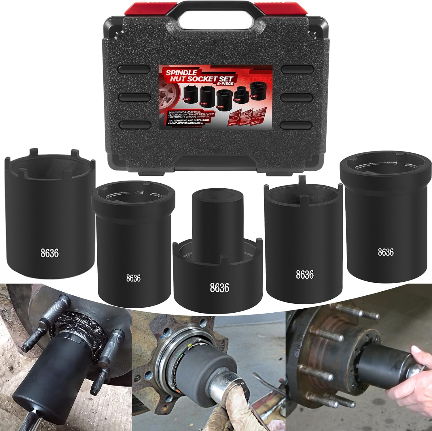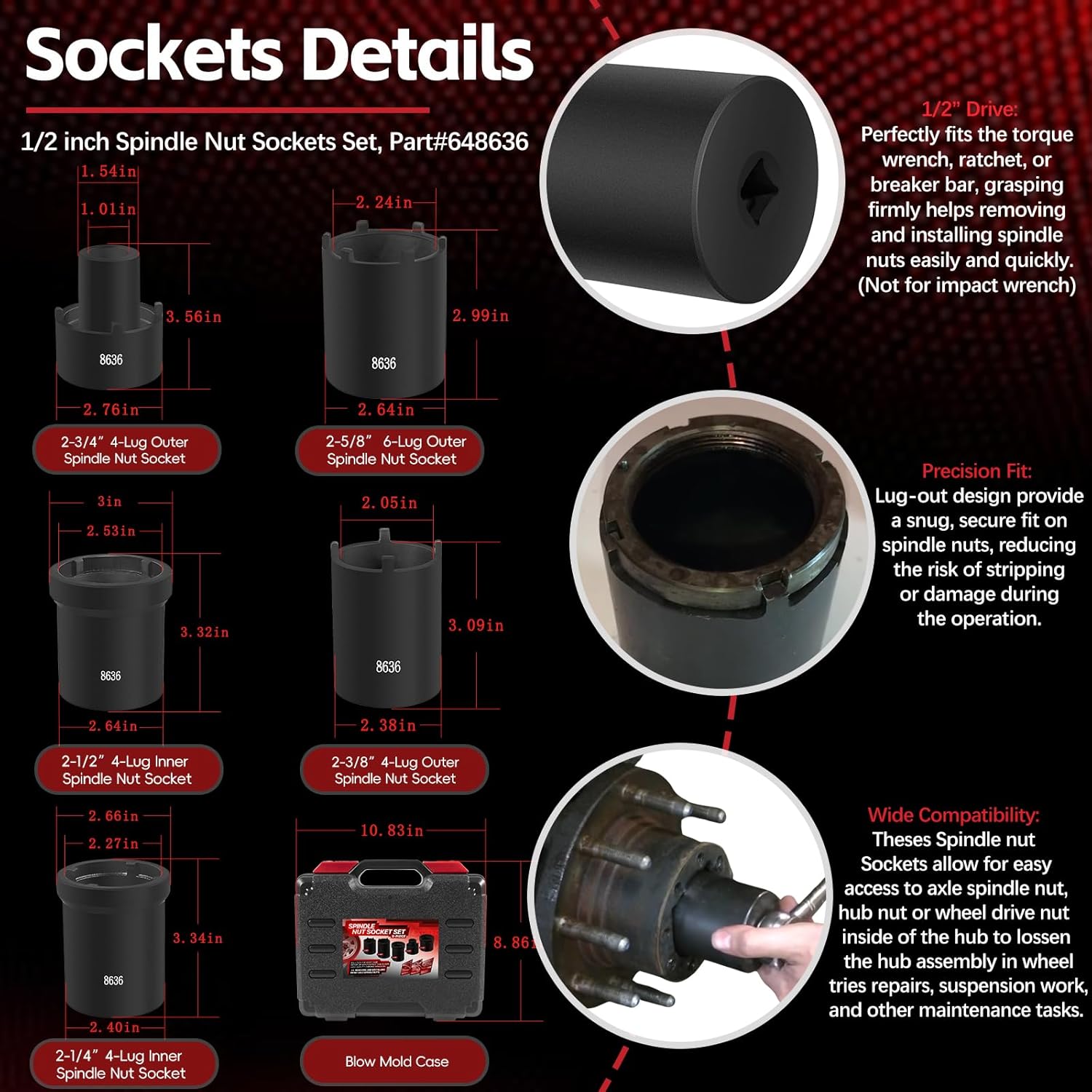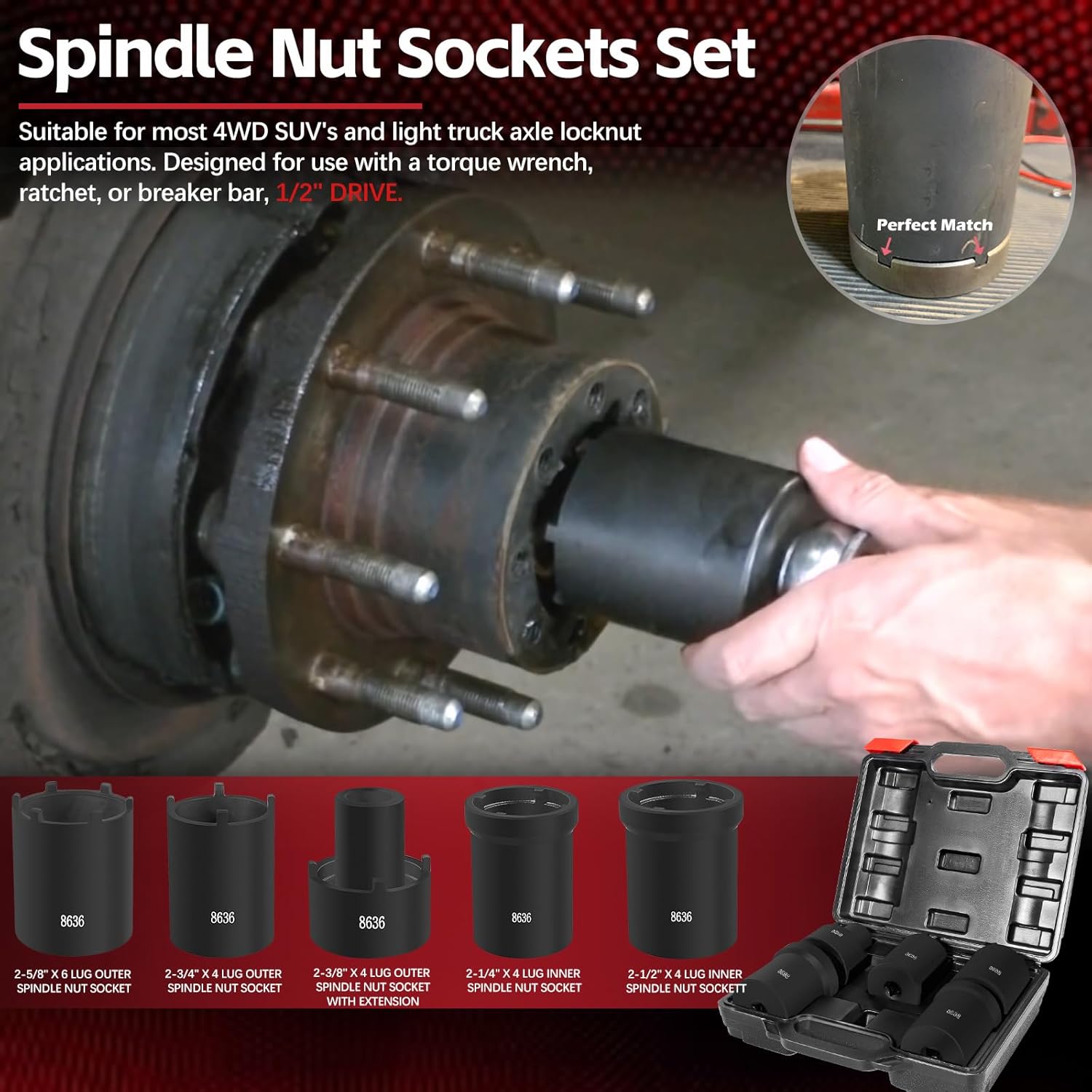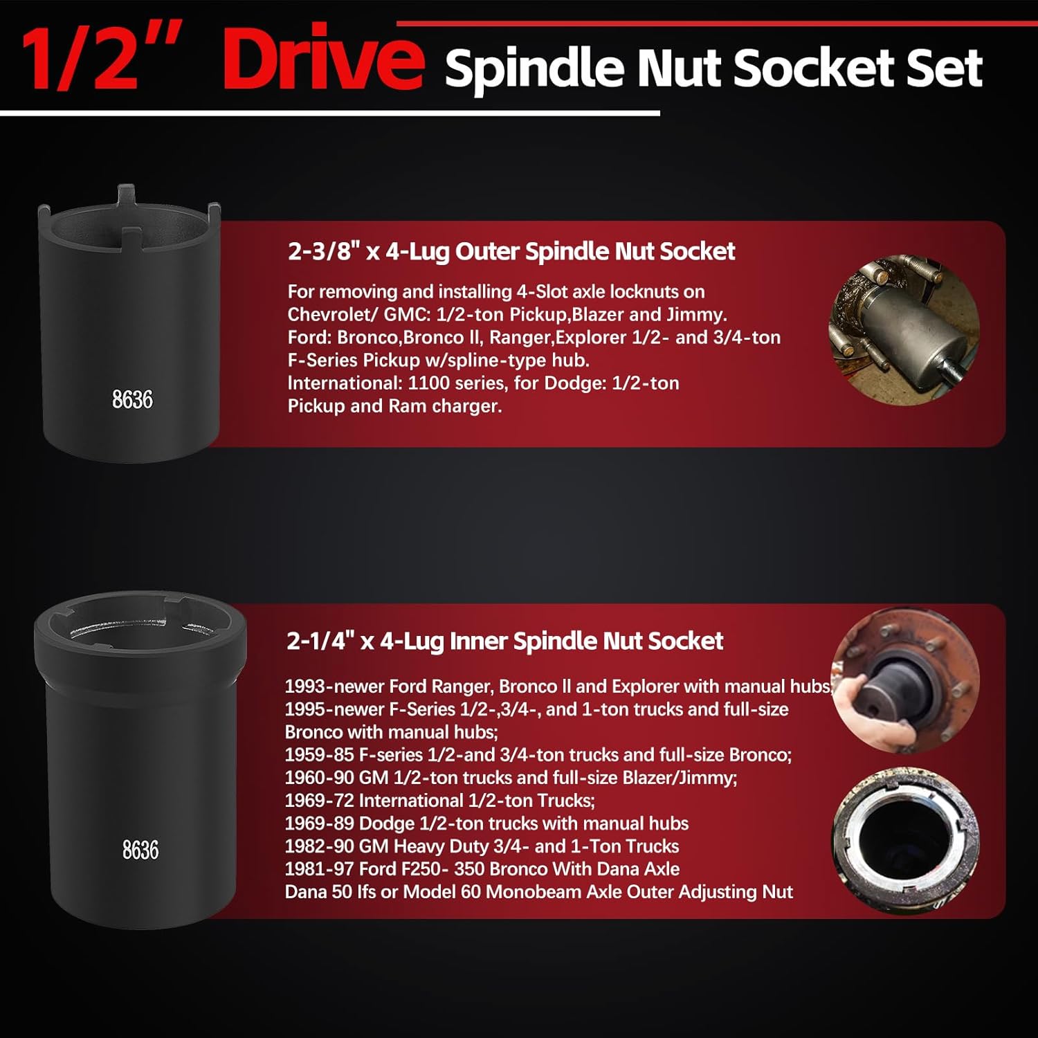 Spindle Nut Socket Tool Kit 5 Pcs Axle Hub Lock Nut Socket Set 1/2” Drive Wheel Drive Spindle Nut Remover Installer for Ford Dana 50/60, Chevy, and Dodge, Replace# 648636 Lug Out Spindle Socket Set