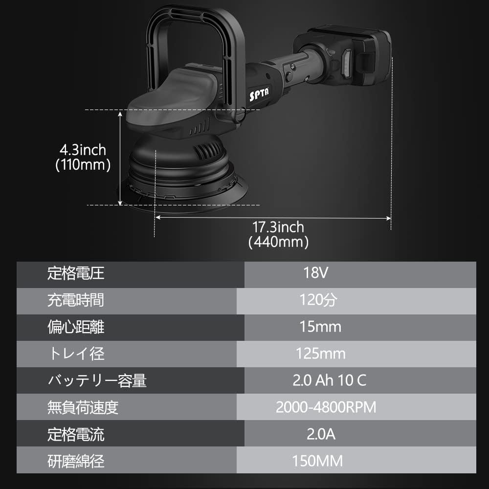 SPTA 18V Cordless Car Polisher, 15mm Orbit 2000-4800 OPM Portable Buffer Polisher with 7 Variable Speed 2Pcs 4.0Ah Battery, 6 Sponge Pads,2 Wool Pad, Tool Bag for Car Polishing, Waxing