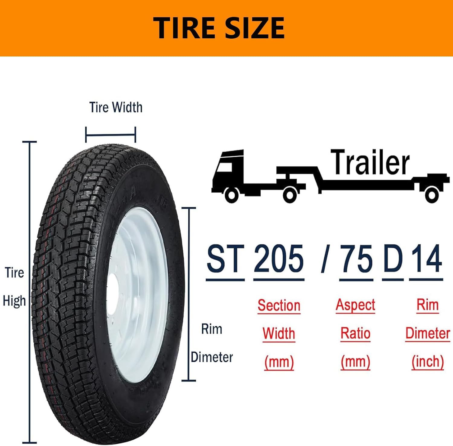 ST205/75D14 Trailer Tires with 14'' Rims, 5 Lug on 4.5'', Load Range C, 6PR