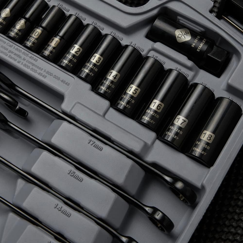 The Stanley 82-839 Black Chrome and Laser Etched Socket Set includes 99 pieces that meet or exceed the American National Standards Institute (ANSI) specifications for combination wrenches, sockets, and ratchets. The laser etched sockets provide hi-visibility markings, making it easier to read compared to standard marked sockets. Black chrome offers a sharper appearance and better corrosion resistance when compared to regular chrome sockets. A 2-piece cases allow for lid removal and enable the back case to be used as a drawer tray. An easy reassemble of the lid to the case provides for convenient tool storage and travel.