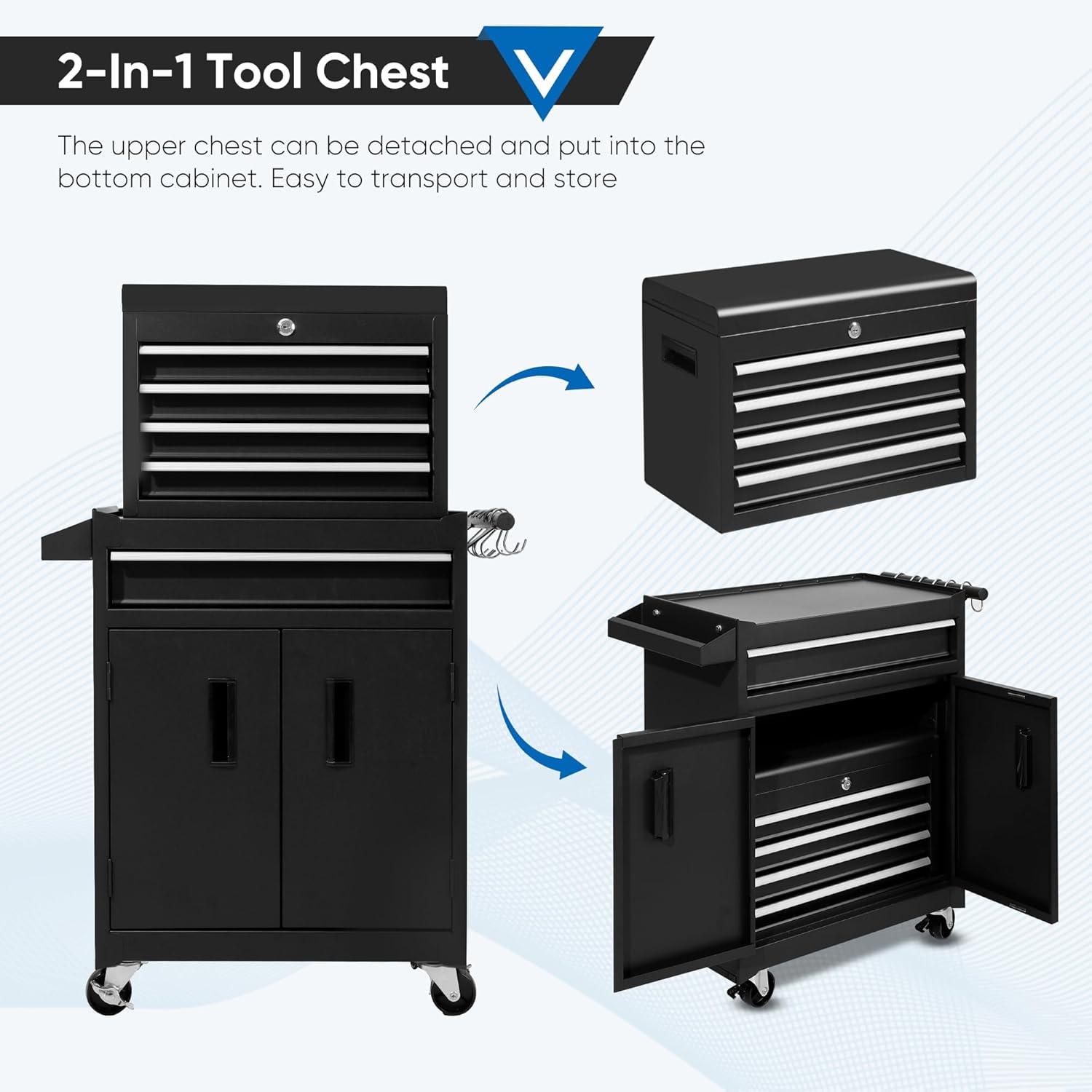 Steelite Tool Chest with Wheels, Large 5-Drawer Tool Box Organizer, Lockable Wheels & Sliding Drawers & Detachable Top & Adjustable Shelf, Metal Rolling Tool Cart for Garage Workshop