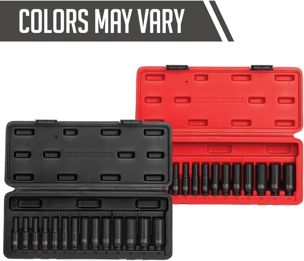 Forged from the finest chrome molybdenum alloy steel-the best choice for strength and durability. This set contains 14 metric-Piece and features spring loaded magnets that retract into the socket for extended bolt applications. Set includes: 4mm, 4.5mm, 5mm, 5.5mm, 6mm, 7mm, 8mm, 9mm, 10mm, 11mm, 12mm, 13mm,14mm and 15mm and a heavy duty blow molded storage case.