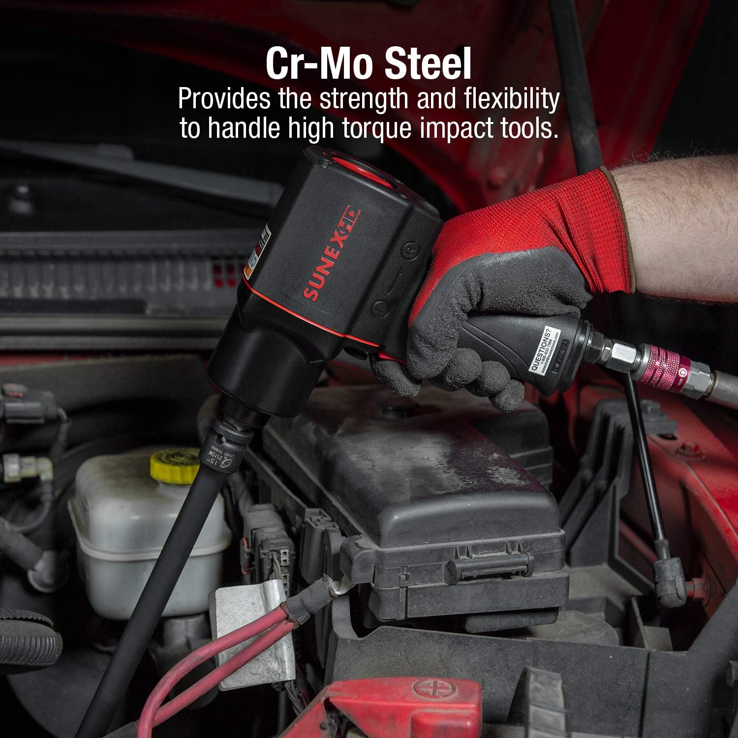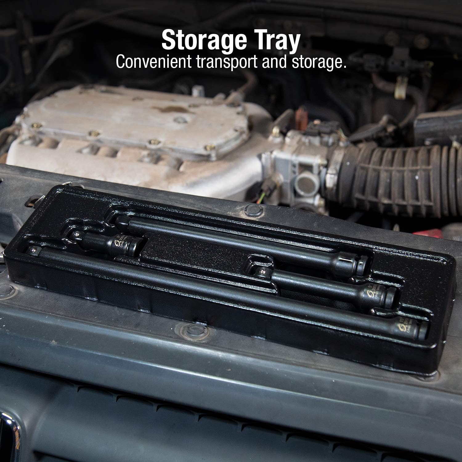 This Sunex 1/2 inch wobble drive extensions 4 piece impact set includes the most common sizes used for automotive repair. It includes 4 SAE extensions It is made of CR-MO alloy steel for long life. It is fully guaranteed and includes a heavy duty blow molded storage case.