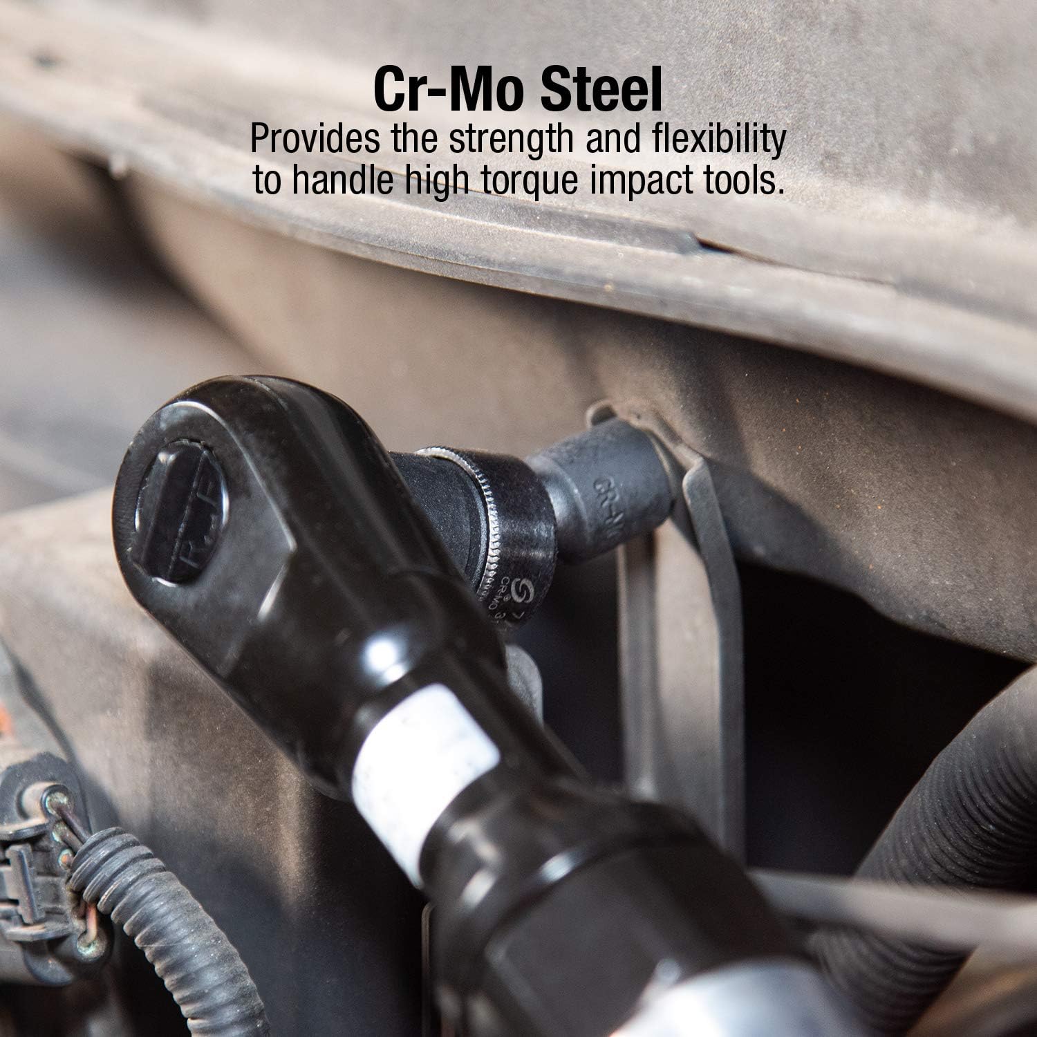 This 3/8 inch drive, universal impact socket set is designed to tackle the toughest jobs with solid durability and keeps them pounding job after job. It features a radius corner design, causing the socket to grab the sturdy wall of the fastener instead of grabbing the corners, resulting in less wear on the fastener. The set includes sizes: 10mm, 11mm, 12mm, 13mm, 14mm, 15mm, 16mm, 17mm, 18mm and 19mm.