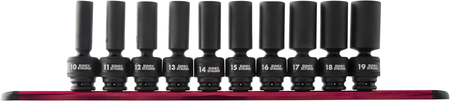 This Sunex 3/8 inch drive 10 piece metric universal deep socket set includes the most common sizes used for automotive repair. It includes 10 metric deep sockets. It is made of CR-MO alloy steel for long life. It is fully guaranteed and includes a heavy molded storage tray.