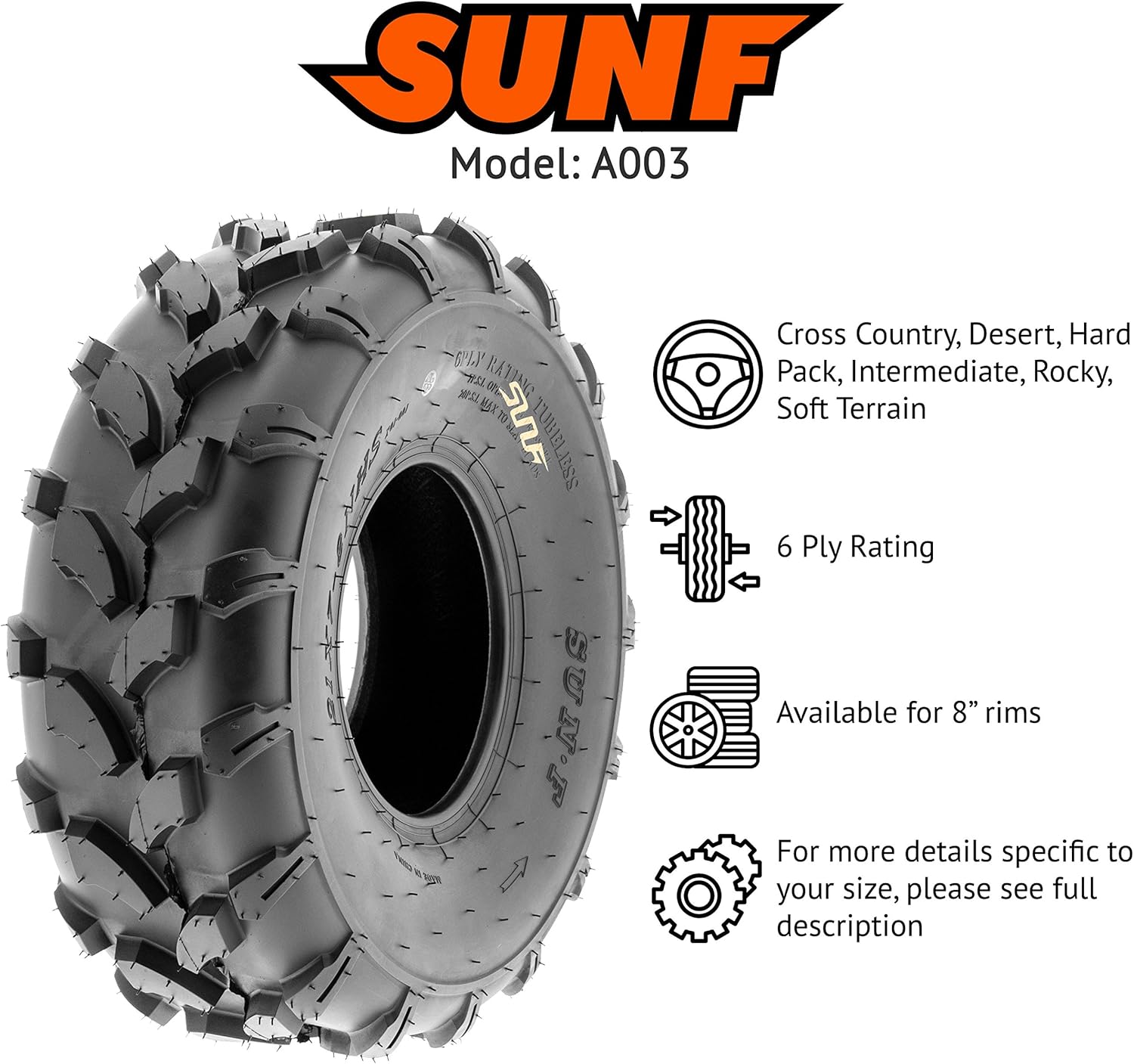 SunF Corporation has dedicated themselves to meeting their customer’s demands and needs. SunF develops and manufactures a wide variety of quality tires in the specialty market. Their line up includes ST trailer, lawn and garden, agriculture, golf cart, ATV Quad Motorcycle, UTV Side by Side, light truck & more!The SUNF A003 ATV tire boasts a purpose-built directional tread pattern that enhances all-terrain capabilities, offering superior traction and stability.All-Terrain Performance: Designed to excel across different terrains, including mud, sand, and rocky surfaces, the A003 tire is a reliable choice for off-road enthusiasts seeking versatile performance.6 Ply Durability: Built with a robust 6-ply construction, the A003 tire guarantees exceptional durability, effectively resisting punctures, cuts, and impacts for prolonged off-road adventures.Shoulder Traction Technology: Featuring advanced shoulder traction technology, the A003 tire ensures optimal grip during cornering and challenging maneuvers on a variety of terrains.Size Versatility: Available in sizes ranging from 18 to 21 inches, the SUNF A003 tire offers a range of options to accommodate various ATV models and rider preferences, ensuring a suitable fit for different setups.Size 1: 18x7-8