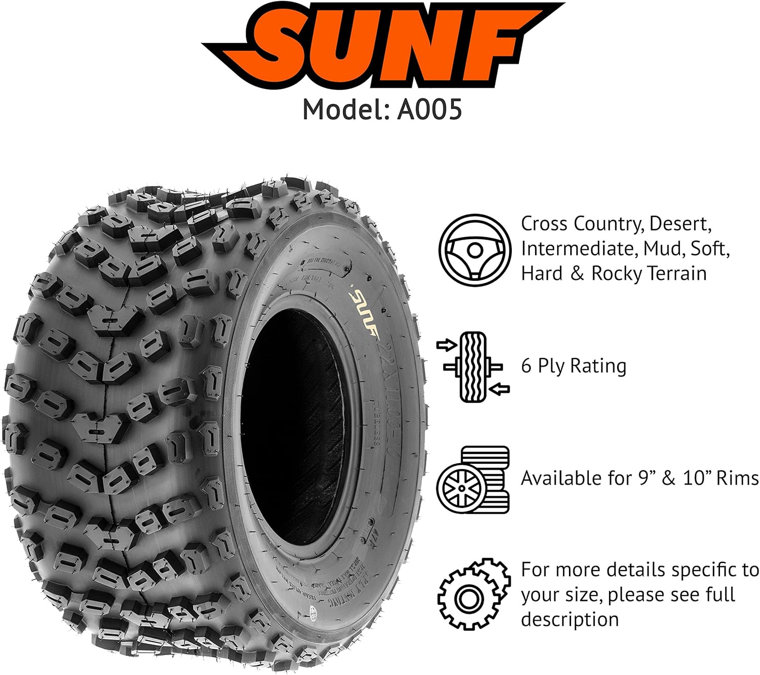 SunF Corporation has dedicated themselves to meeting their customer’s demands and needs. SunF develops and manufactures a wide variety of quality tires in the specialty market. Their line up includes ST trailer, lawn and garden, agriculture, golf cart, ATV Quad Motorcycle, UTV Side by Side, light truck & more!The SUNF A005 ATV tire boasts an advanced directional "V" tread pattern, optimizing all-terrain performance by delivering outstanding traction and stability.All-Terrain Versatility: Designed to excel across a variety of terrains, including mud, sand, and rocky surfaces, the A005 tire provides reliable and consistent performance for off-road enthusiasts.Robust 6 Ply Construction: Built with a sturdy 6-ply construction, the A005 tire is engineered to withstand tough conditions, offering heightened durability and resilience against punctures, cuts, and impacts.Shoulder Traction Enhancement: Featuring innovative shoulder traction technology, the A005 tire ensures superior grip during turns and challenging maneuvers, making it an ideal choice for diverse terrains.Available Size Options: Offered in 18 and 22 inches, the SUNF A005 tire provides a range of sizes to accommodate different ATV models and rider preferences, ensuring a tailored fit for various vehicle setups and needs.Size 1: 22x11-10