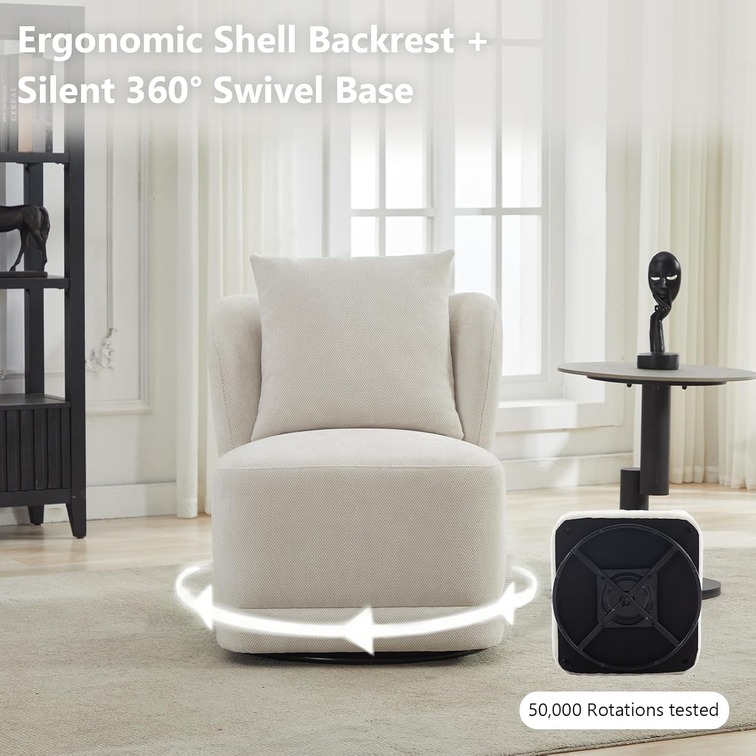 Swivel Accent Chair for Living Room,360° Rotating Barrel Chair with Square Back Pillow,Boucle Swivel Chair,Modern Linen Fabric Recliner for Adults,Cream White