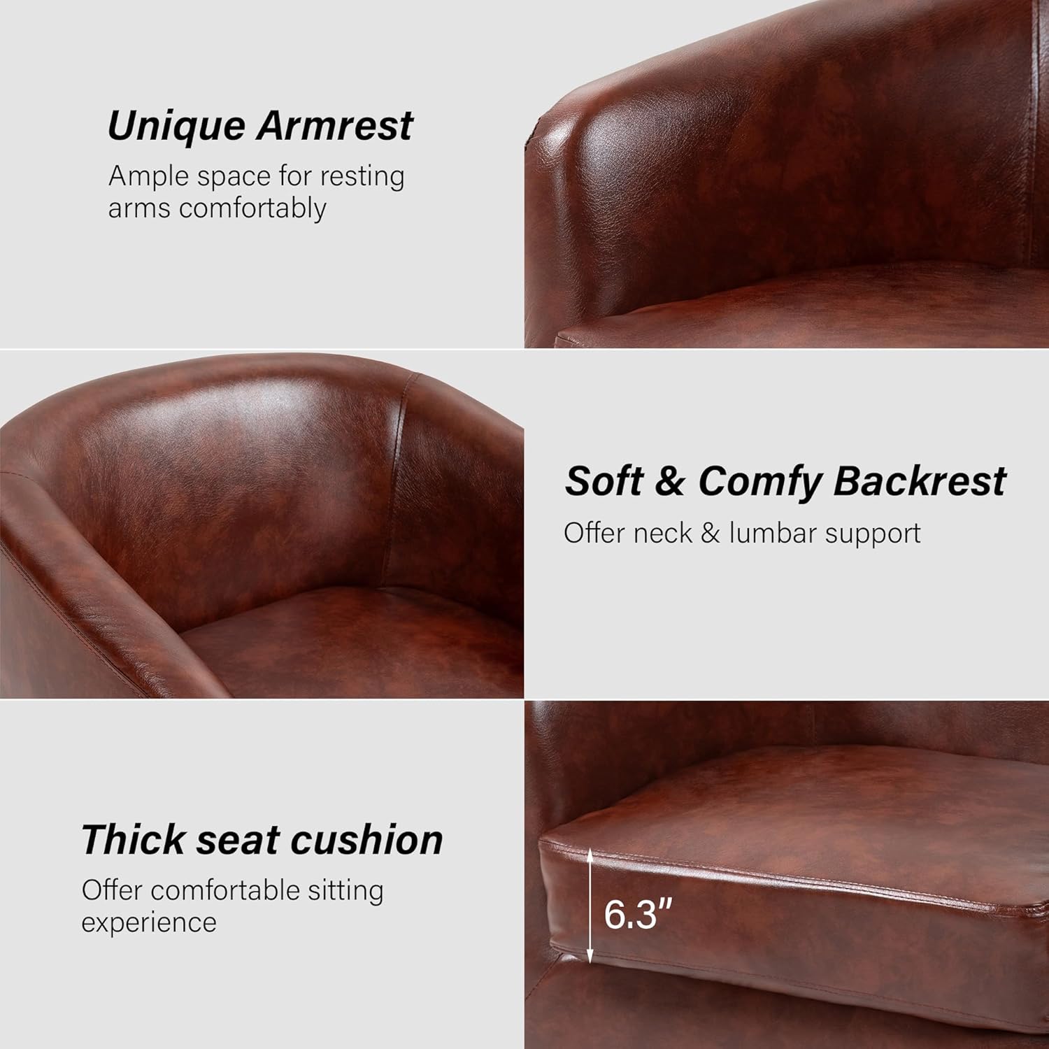 Swivel Barrel Chair, Modern Round PU Leather Accent Armchair for Living Room, Bedroom, Oversized Comfy Club Reading Chairs for Adults (Leather Red Brown, Set of 1)