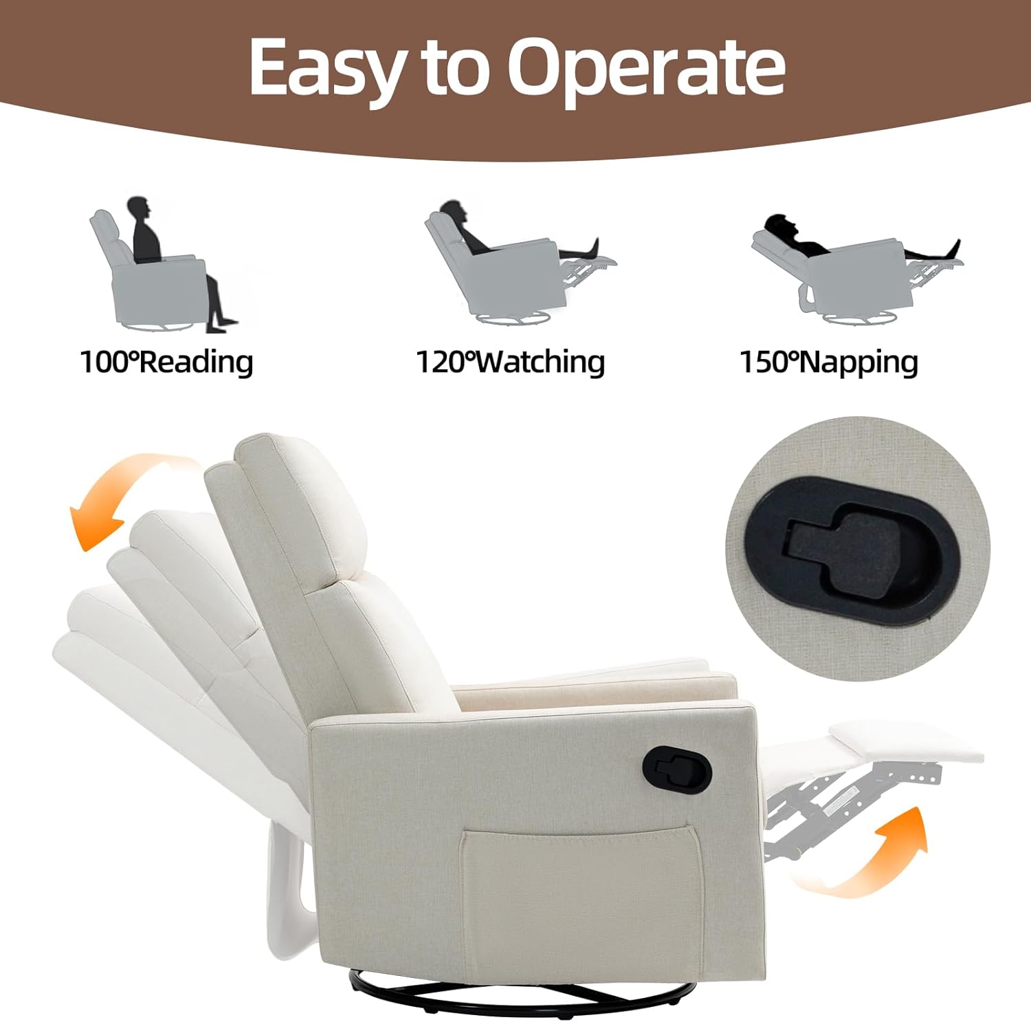 Our swivel glider recliner offers a smooth and gentle 360° swivel, and features a 30° rocking back and forth motion to help you or baby fall asleep better and faster.The backrest can be tilted from 95 degrees to 160 degrees, Footrest adjustment angle is 0-90°, to meet the needs of different scenes and you can fully relax in this nursery glider chair.