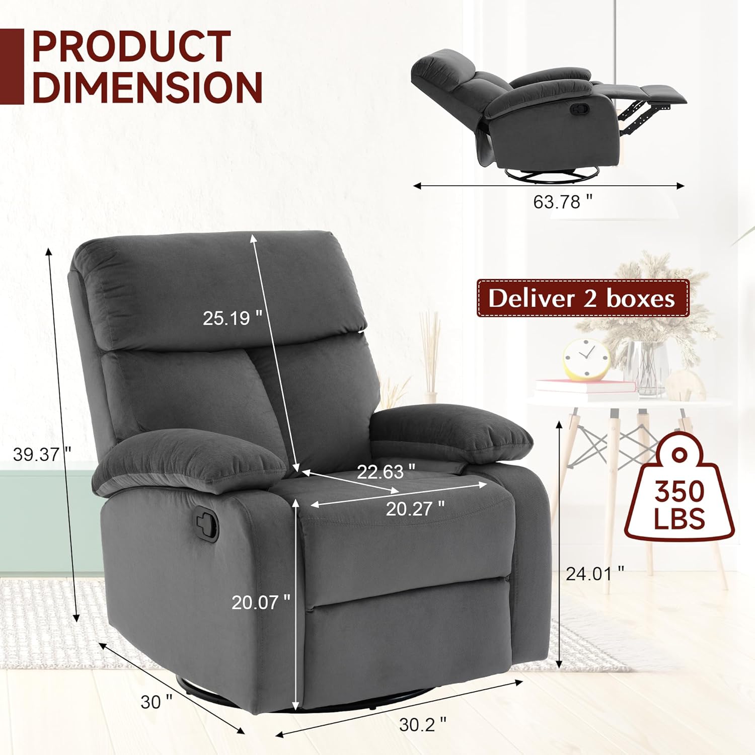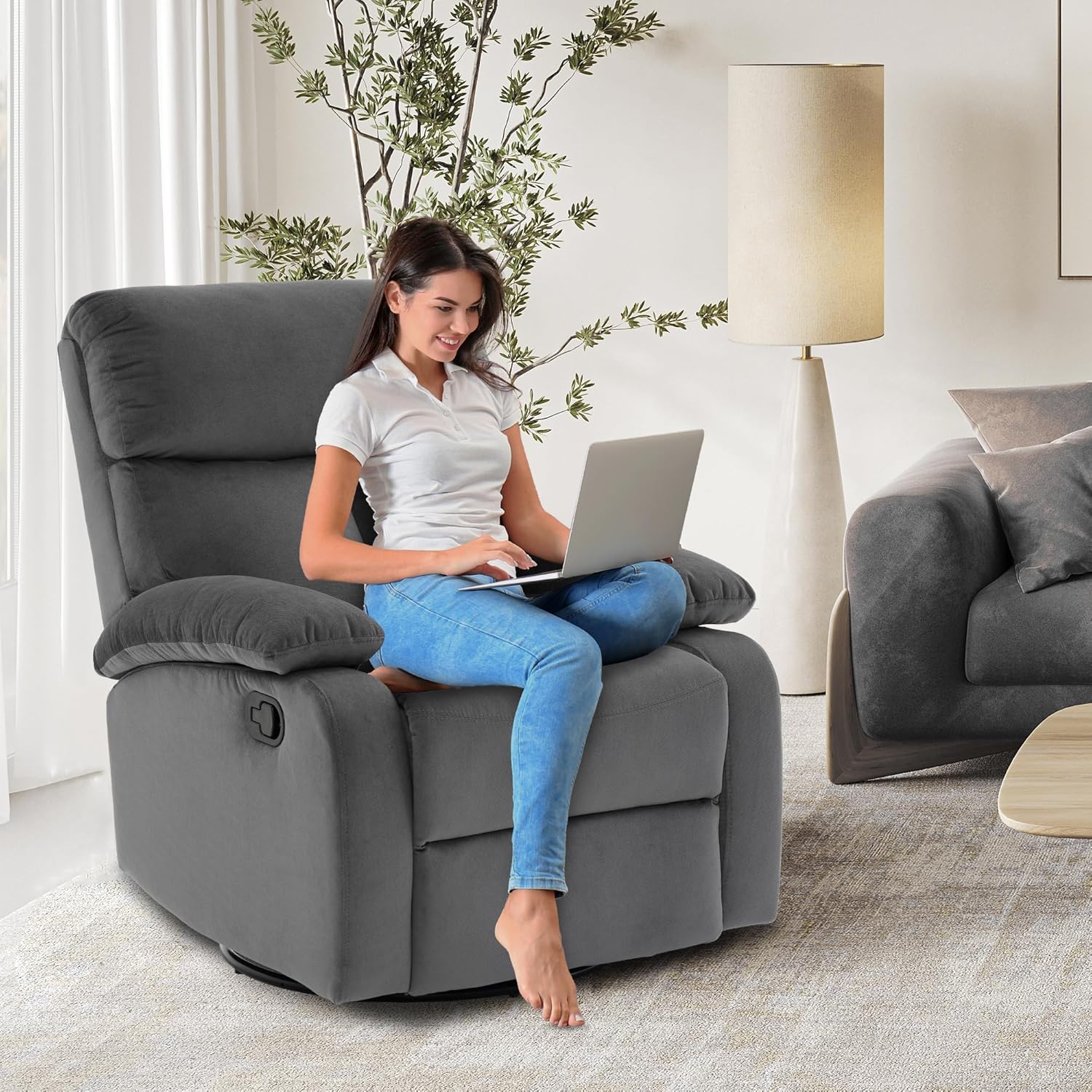 Swivel Rocker - Small Recliner for Small Spaces with Overstuffed Arms and Back, Manual Swivel Recliner Chair with Ultra-Soft Velvet for Living Room, Nursery, Bedroom, Dark Gray