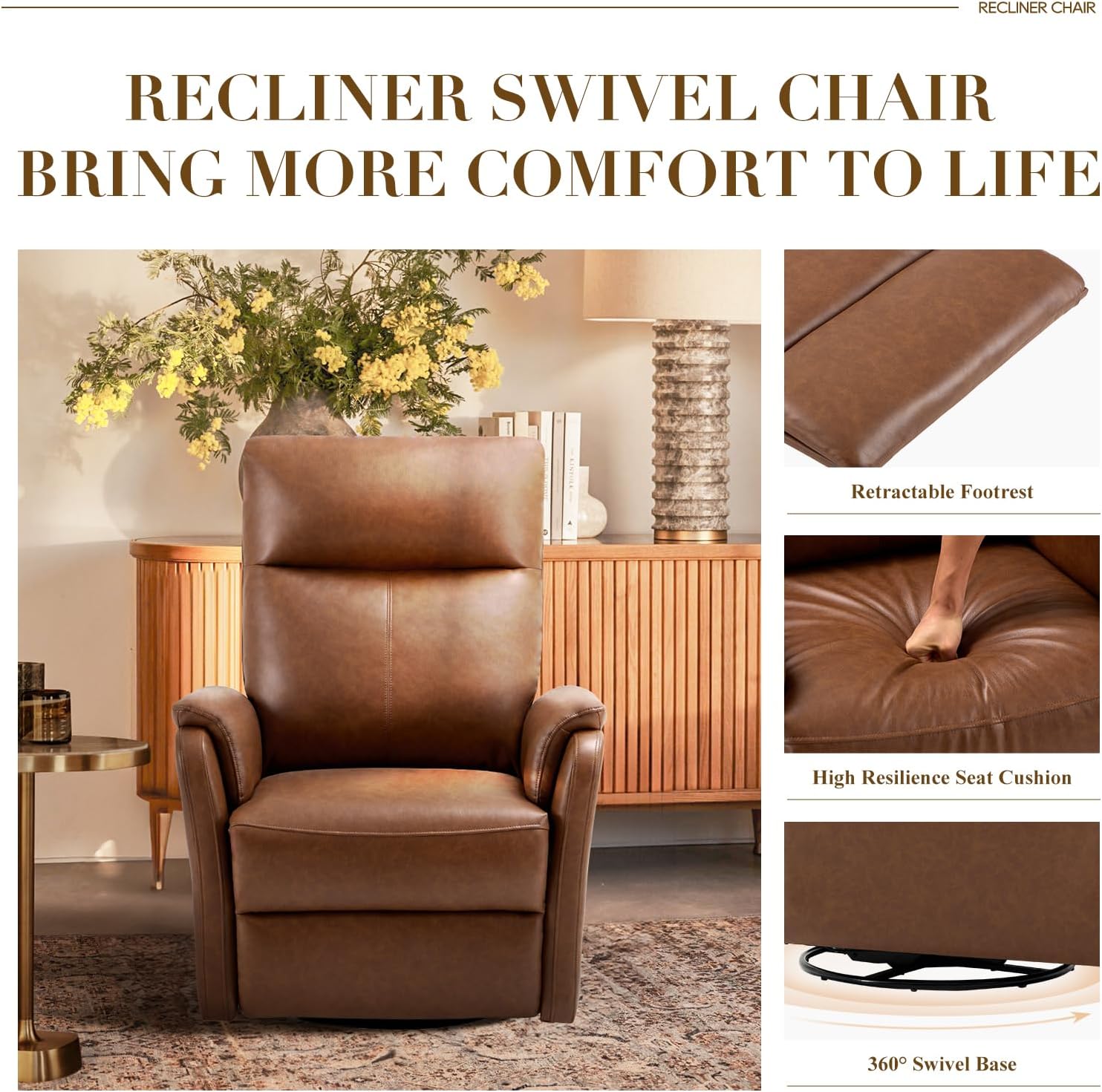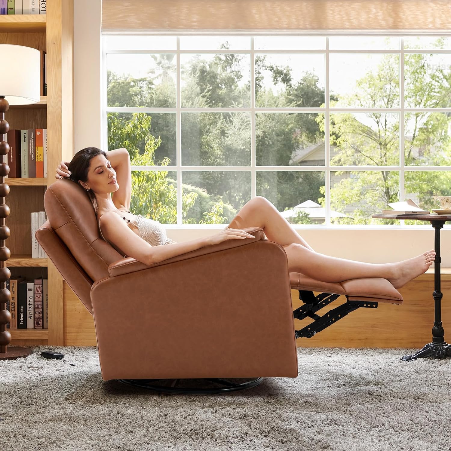 Swivel Rocking Recliner Glider Chair, Leather Reclining Rocker Chair with Footrest for Living Room, Nursery, Office, Bedroom, Ergonomic High Backrest, Wide Seat Cushion and Metal Base-Cocoa