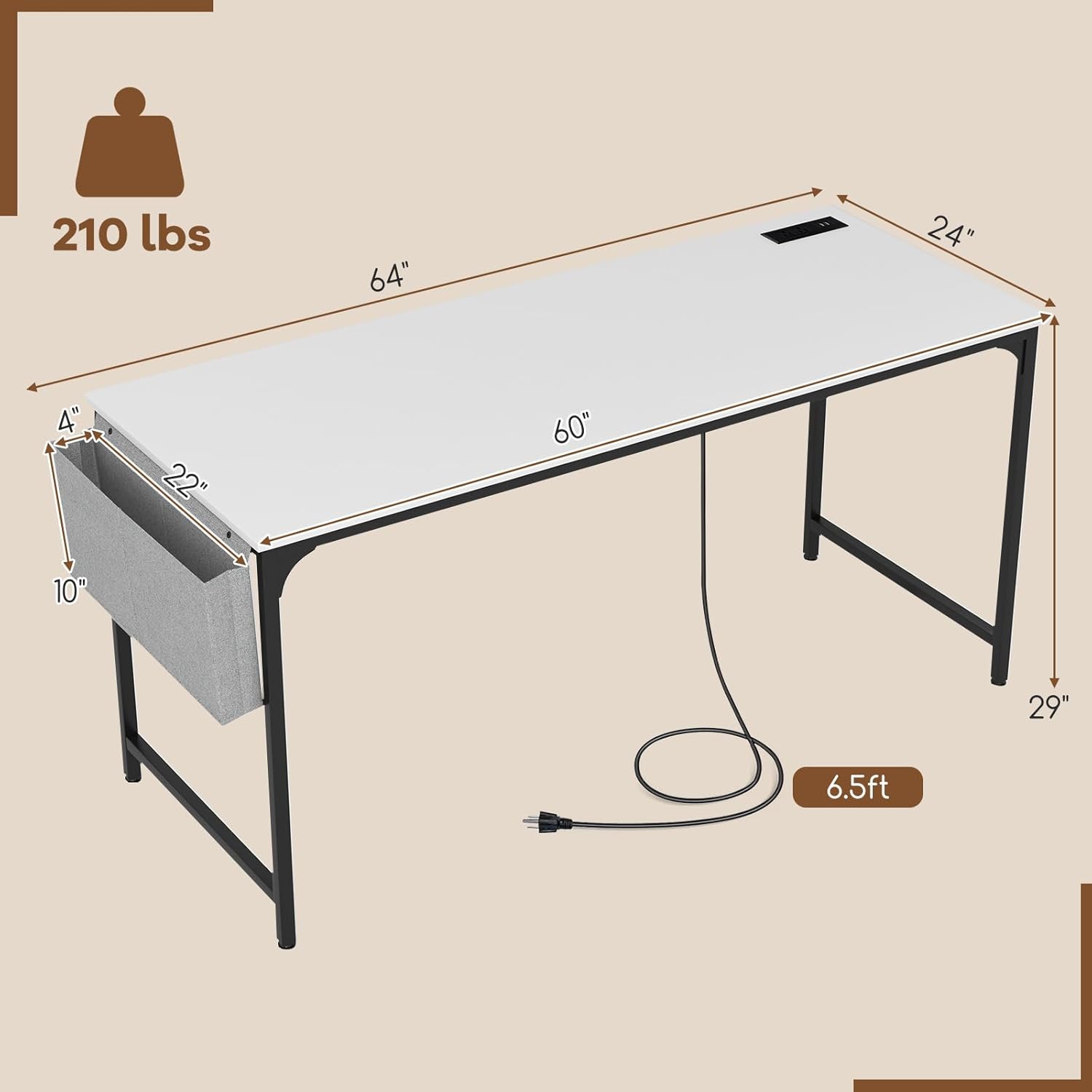 Tangkula 60” Large Computer Desk with Charging Station, Modern Simple Study Writing Desk with Storage Bag, Headphone Hook, Sturdy Metal Frame, Home Office Workstation
