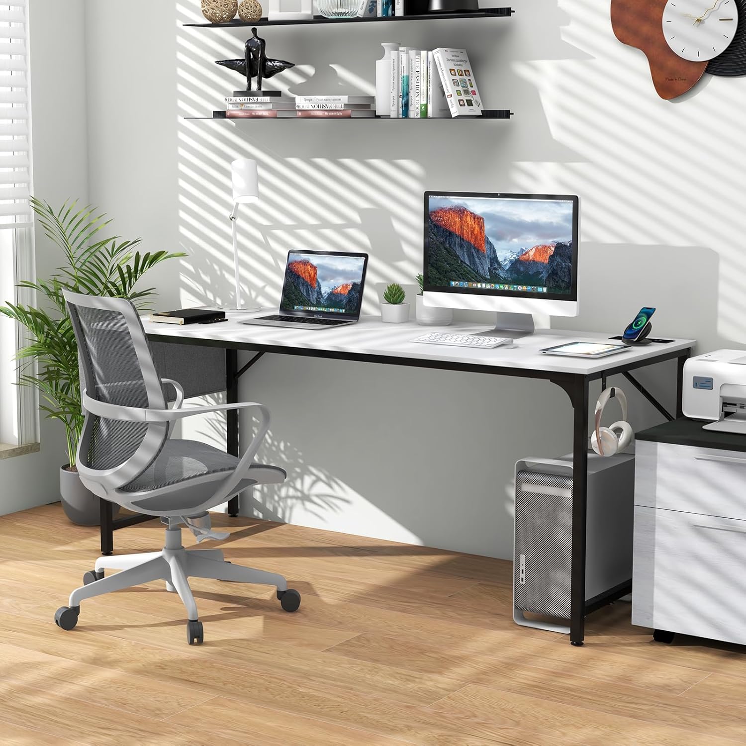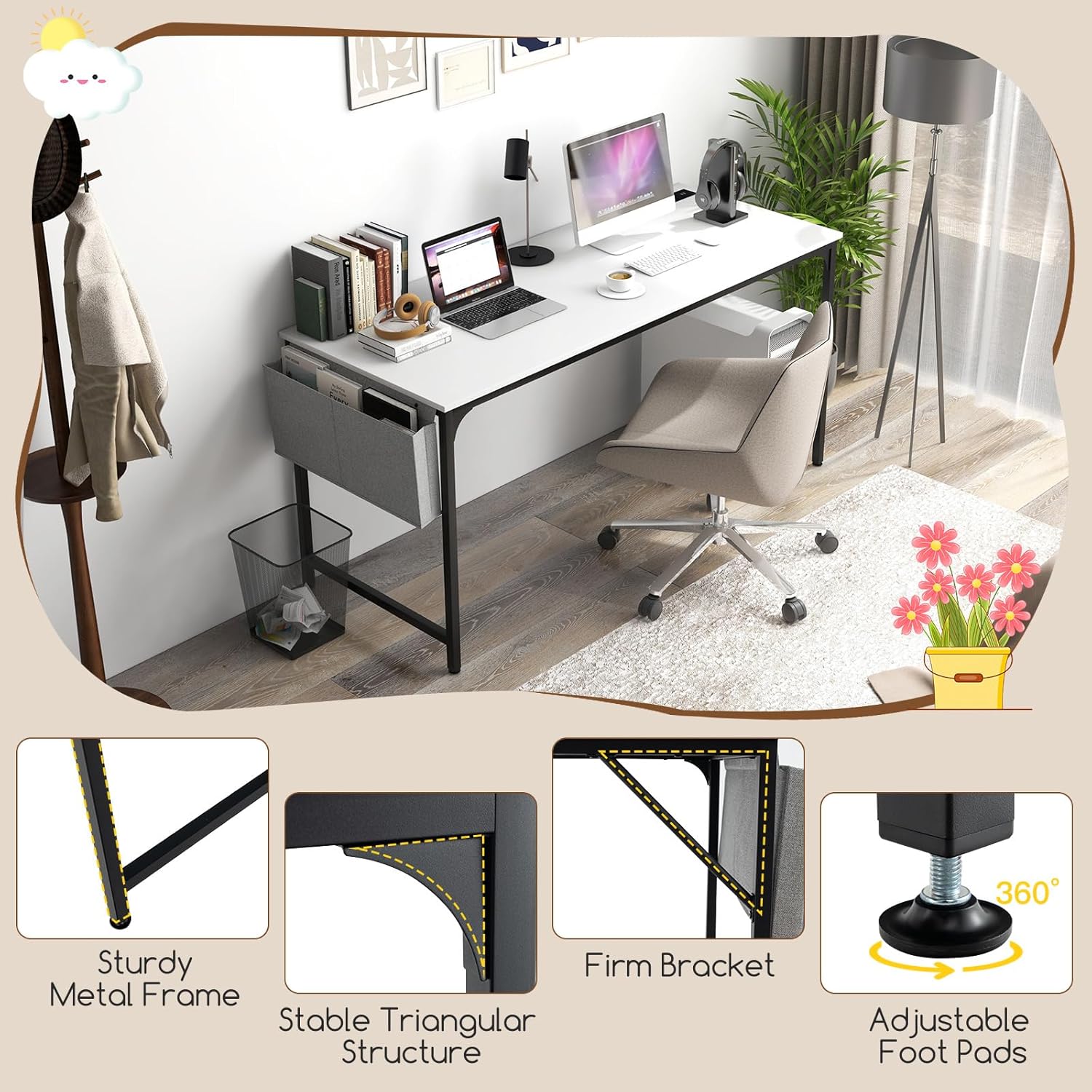 It boasts built-in charging station, keeping your devices powered up and ready for action. In addition, the spacious desktop provides ample room to spread out your essentials while the storage bag and headphone hook ensure items are easily accessible, promoting a tidy environment that's conducive to working efficiently. Crafted with a robust metal frame and reinforced bracket, this writing desk is built to last and provides reliable support. Moreover, this versatile home office desk acts well as a functional workstation, an elegant writing desk, or a gaming desk, perfect for a variety of rooms.