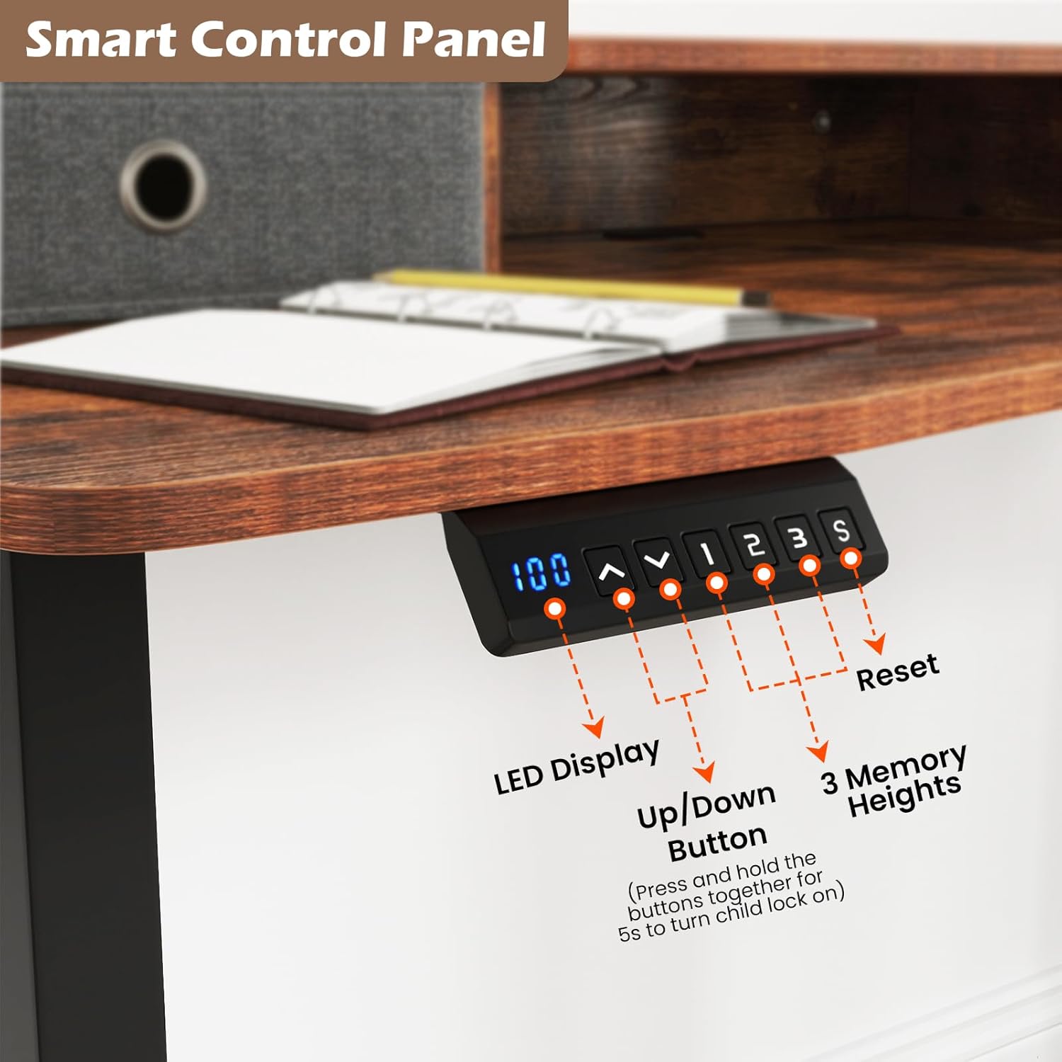 Designed for users of different heights, the standing desk can be adjusted from 29" to 48" using the digital panel. And the powerful motor allows for smooth lifting without interrupting your work or study. This standing desk features a large desktop, storage shelf and 2 drawers, helping well organize your monitor, books, office supplies. All in one storage situation helps to keep you a tidy workspace. Besides, you can conveniently hang headset on the side hooks. Supported by T-shaped metal legs and adjustable foot pads, the stand up desk is more stable for use.