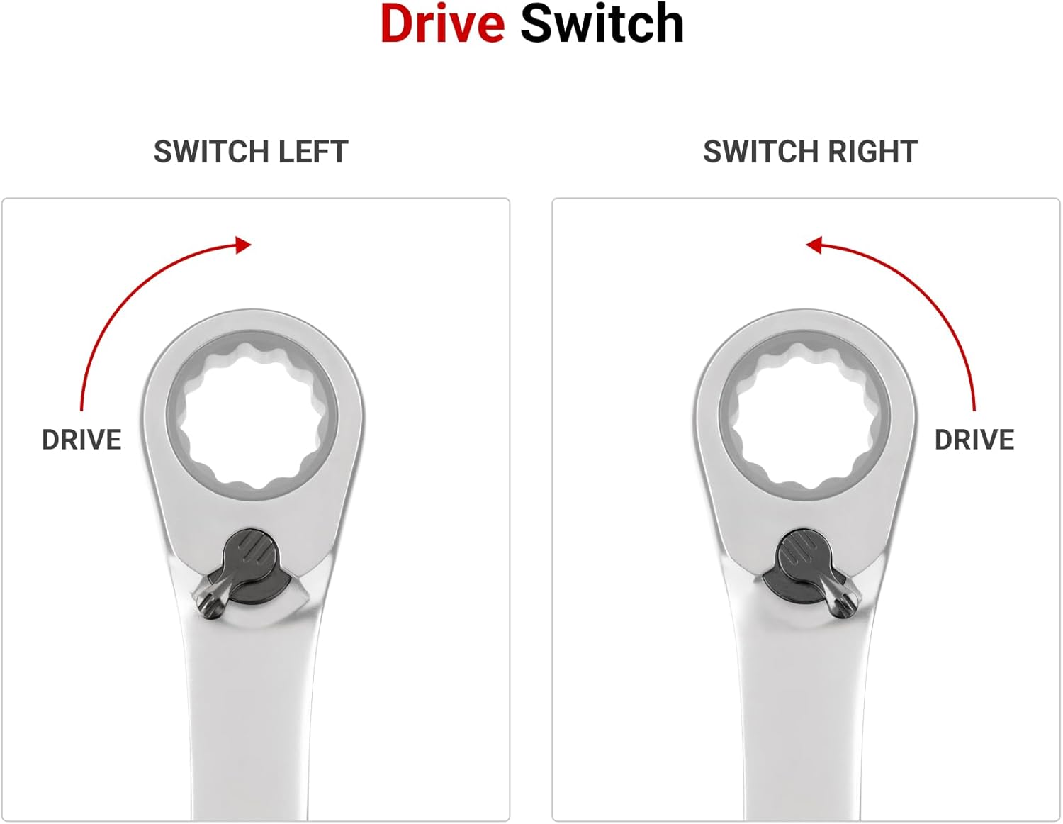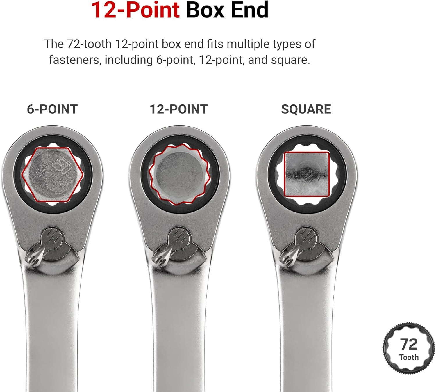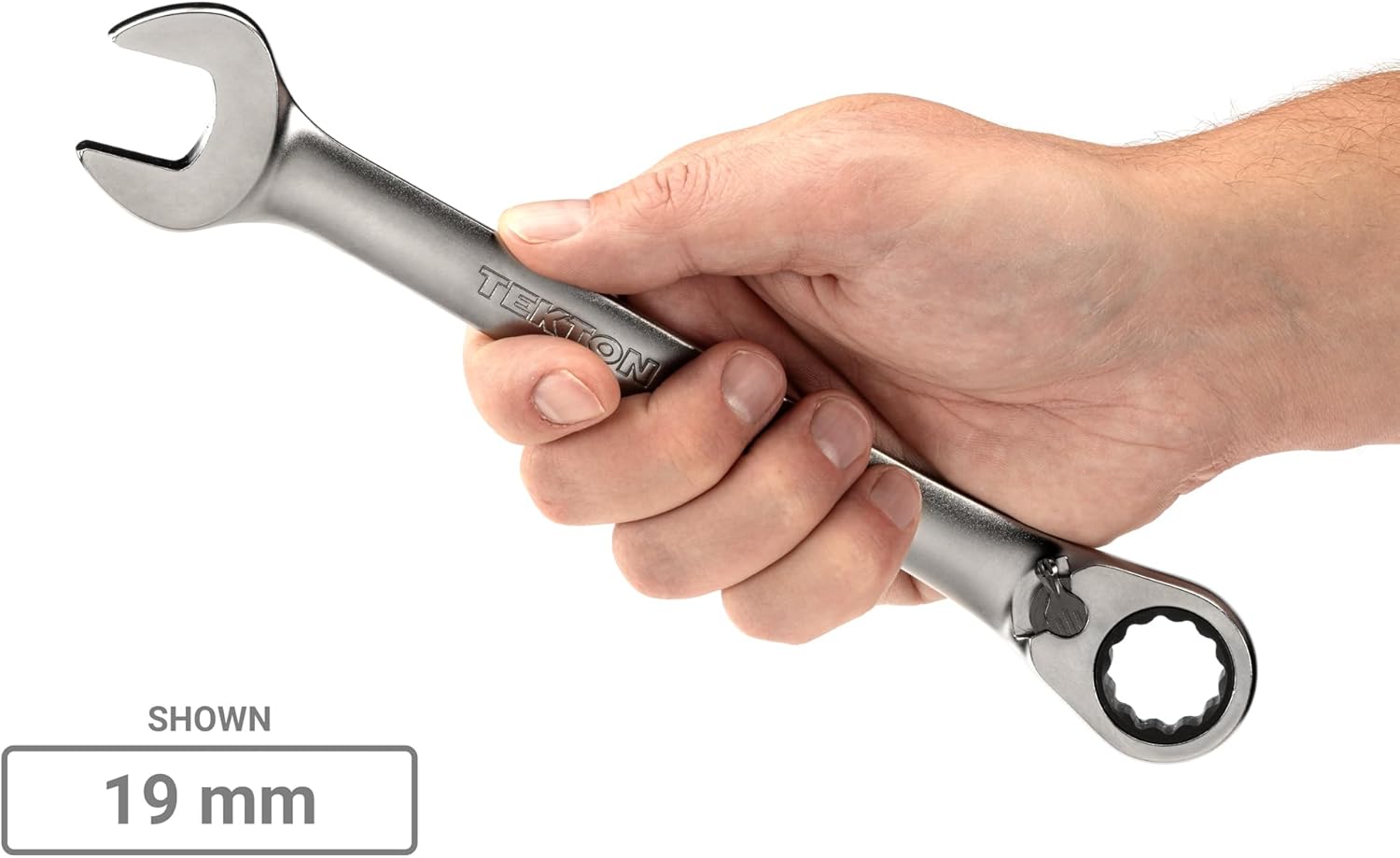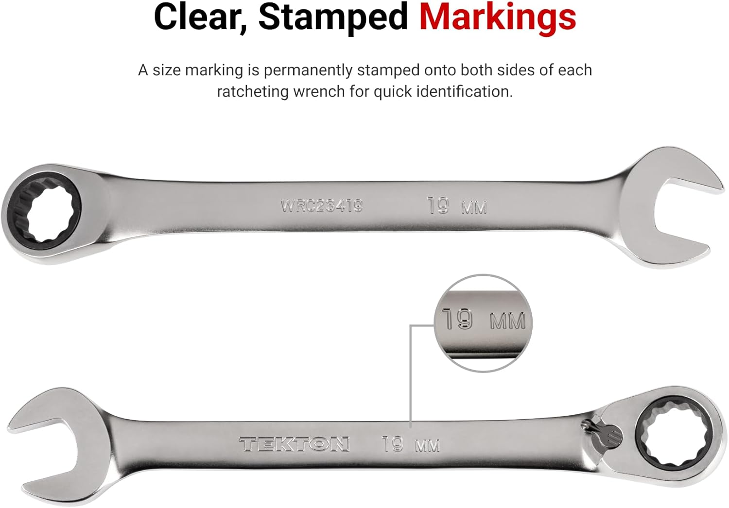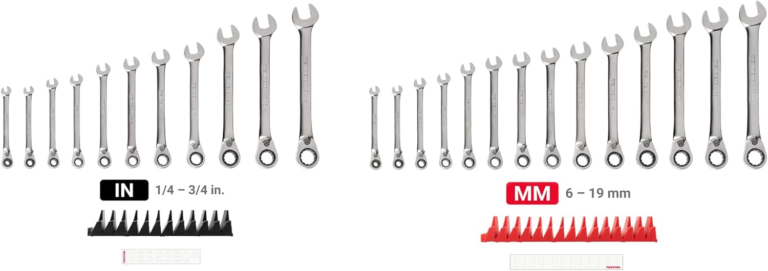 Each Tekton reversible ratcheting combination wrench is permanently marked with both a high-visibility laser marking and a stamped marking for easy size identification. The 12-point box end fits multiple types of fasteners including 6-point, 12-point, and square. The 15-degree offset box end wrench geometry creates clearance for your fingers and makes it easier to reach around obstructions. The drive switch allows you to quickly switch ratcheting directions while you're working. The wrench is abrasive-blasted to create a finely textured finish and then plated with a trivalent chrome process, ensuring that the finish won't flake off or corrode over time. The set includes a modular wrench organizer that fits most toolbox drawers, keeping your ratcheting wrenches neatly arranged with consistent spacing.