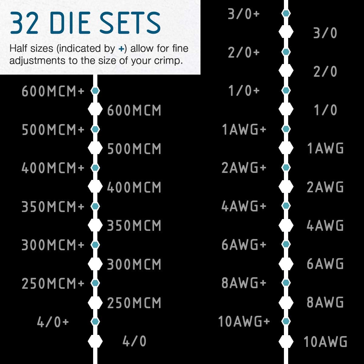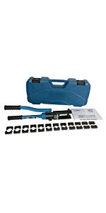 Included Crimp Dies AWG | Yes. Eight sets: 6, 4, 3, 2, 1/0, 2/0, 4/0 AWG. | Yes. Nine sets: 12, 9, 8, 6, 4, 3, 2, 1/0, 2/0 AWG. | Yes. Seven sets: 35, 25, 16, 10, 8, 6, 4 | Not applicable. Dies not required. | Not applicable. Dies not required. | Not applicable. Dies not required. |