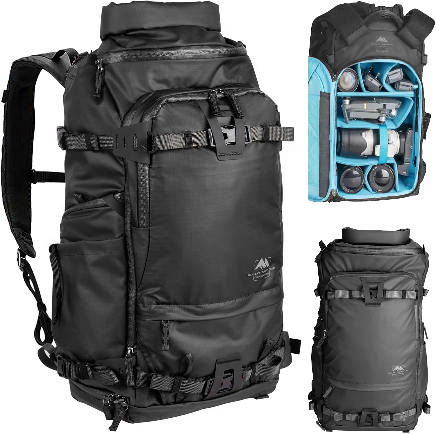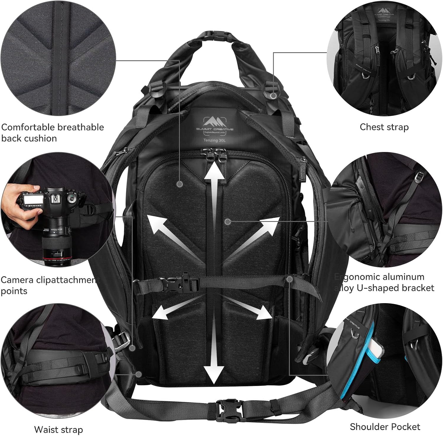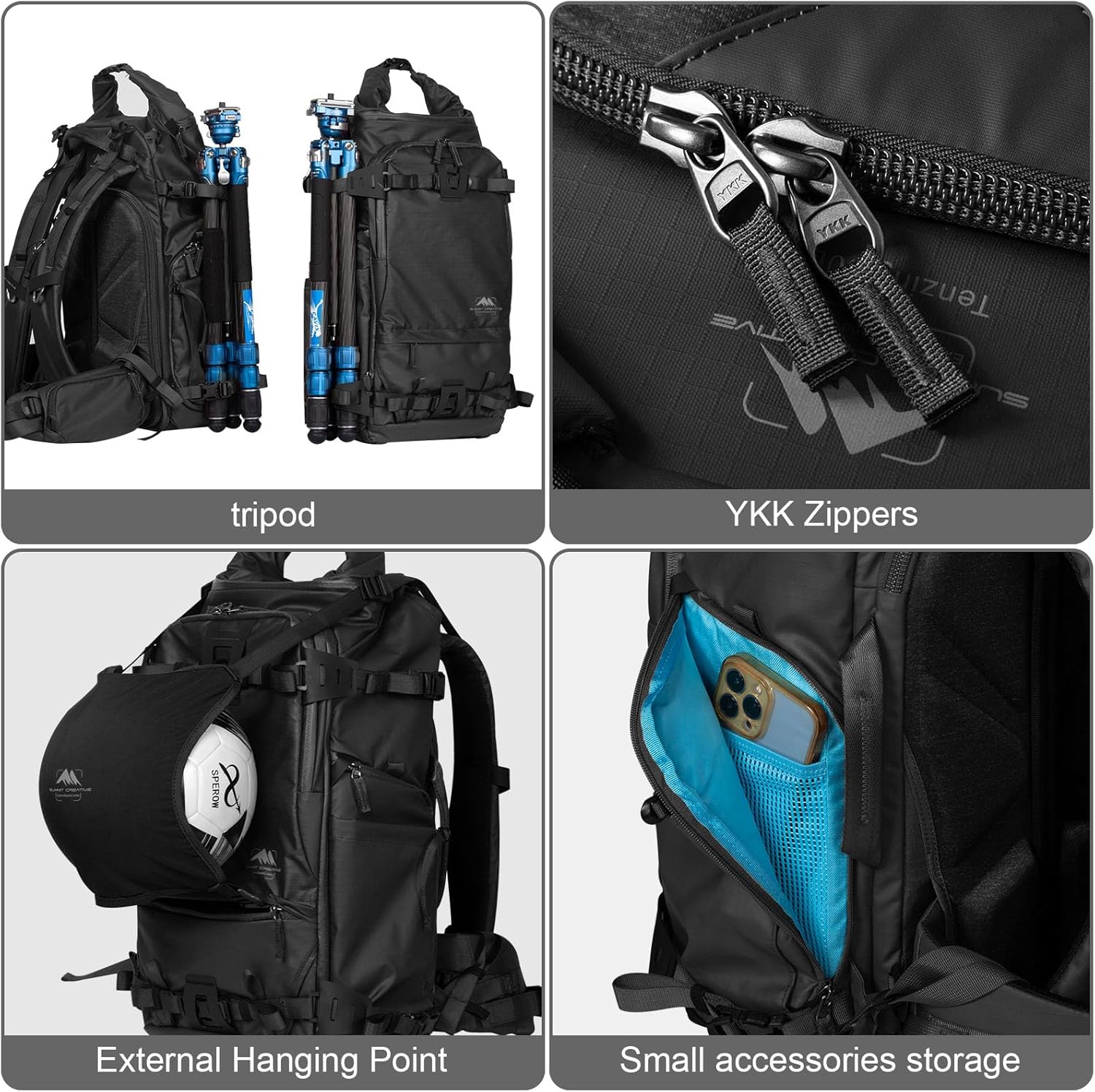 Tenzing 40 liter Water Resistant Camera Backpack 16 inch Laptop Compartment with Rain Cover Fits DSLR, SLR, Drone, Mirrorless Cameras, Batteries, Lenses,Tripod Black