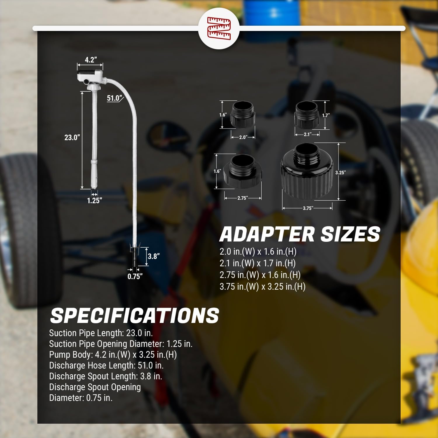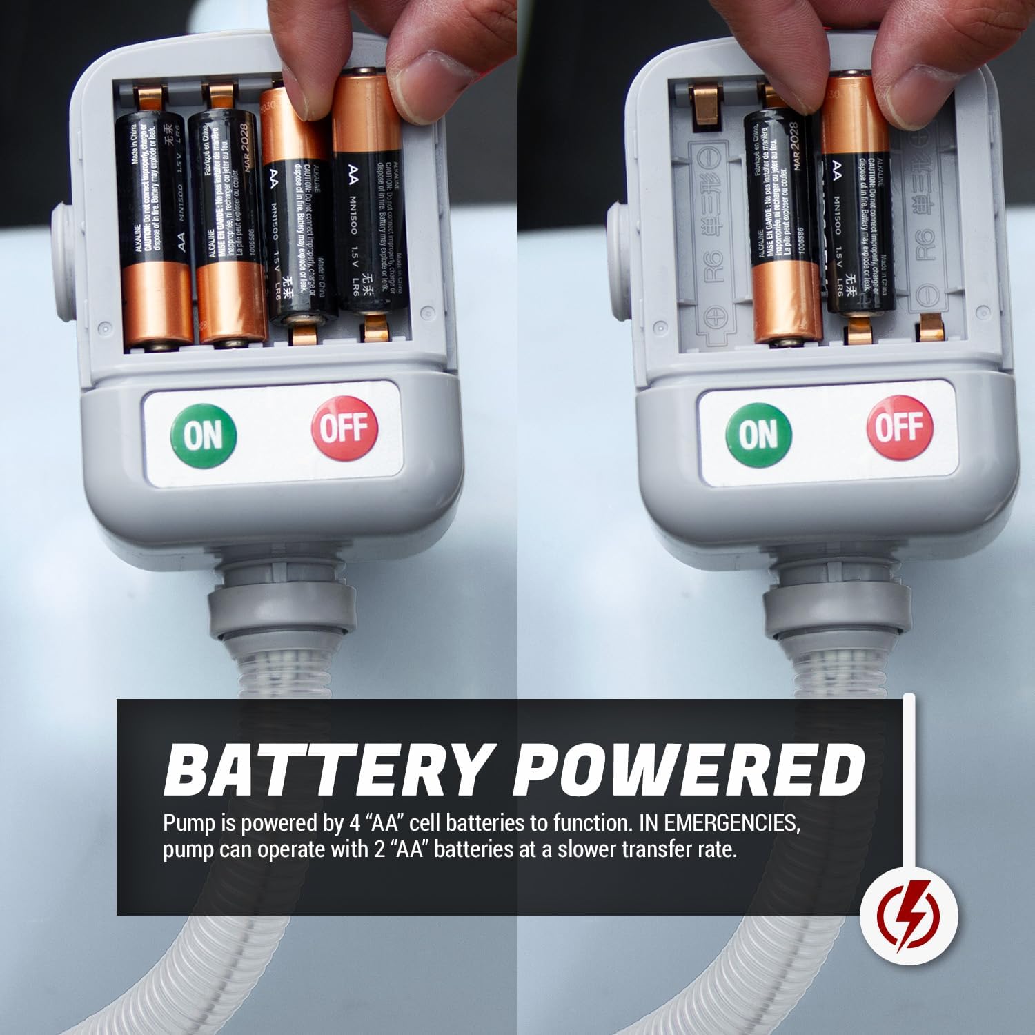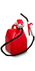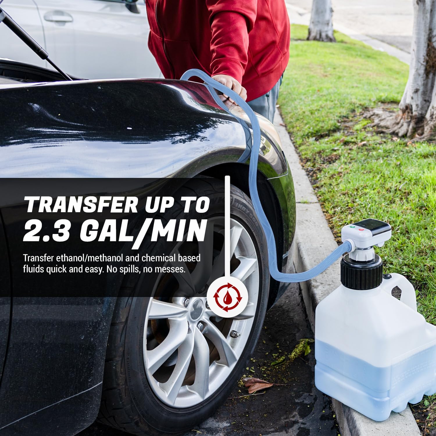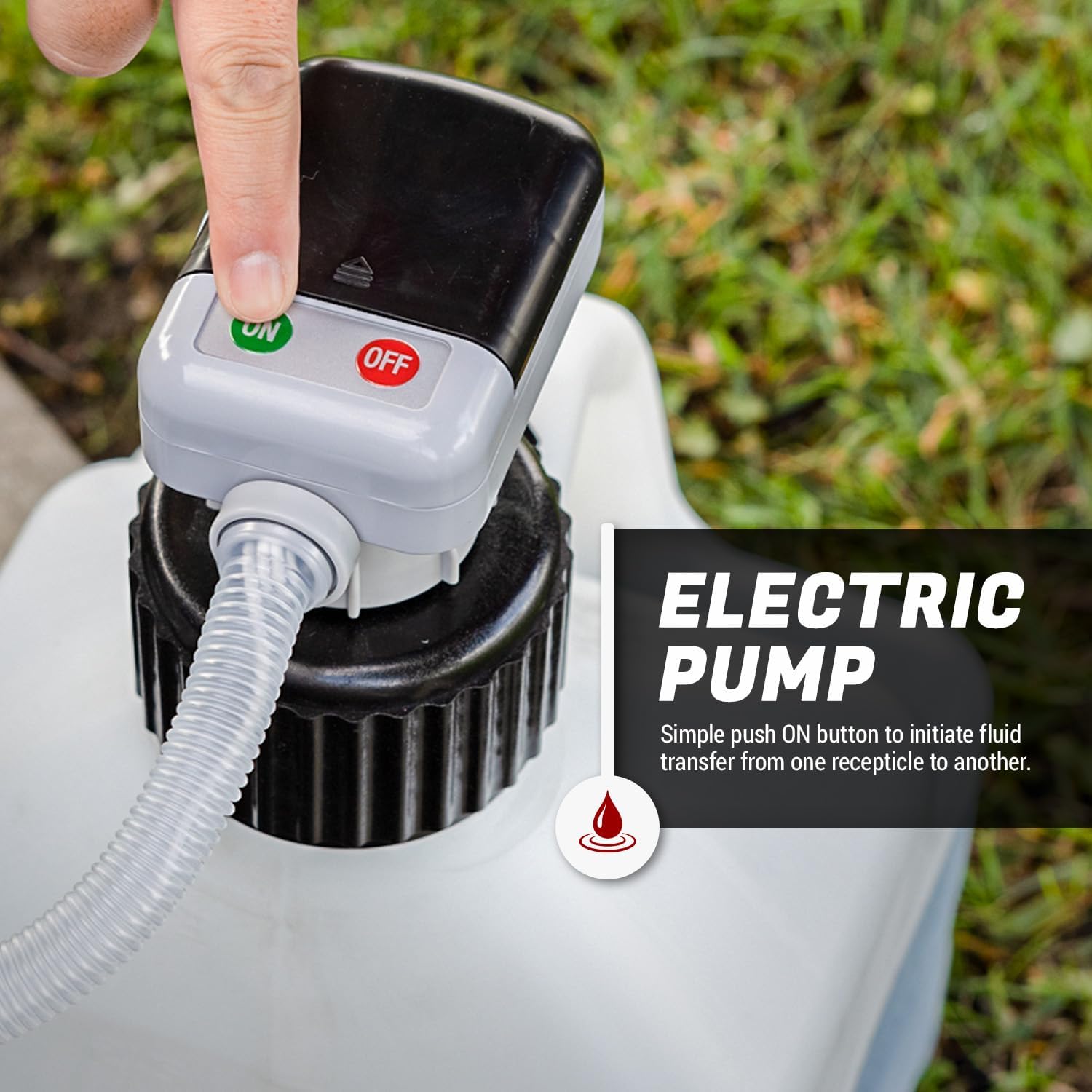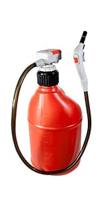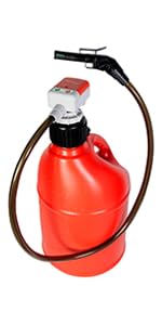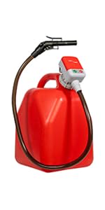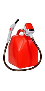 Automatically transfers fuel with a press of a button without the need to lift heavy cans. Water-Resistant Power Buttons will protect against accidental splashes or even in the rain. Flexible outtake hose to reach racing fuel cells, refuel from the dock without making a mess. Useful in the garage, shop, yard, farm, dock, snow or campsite