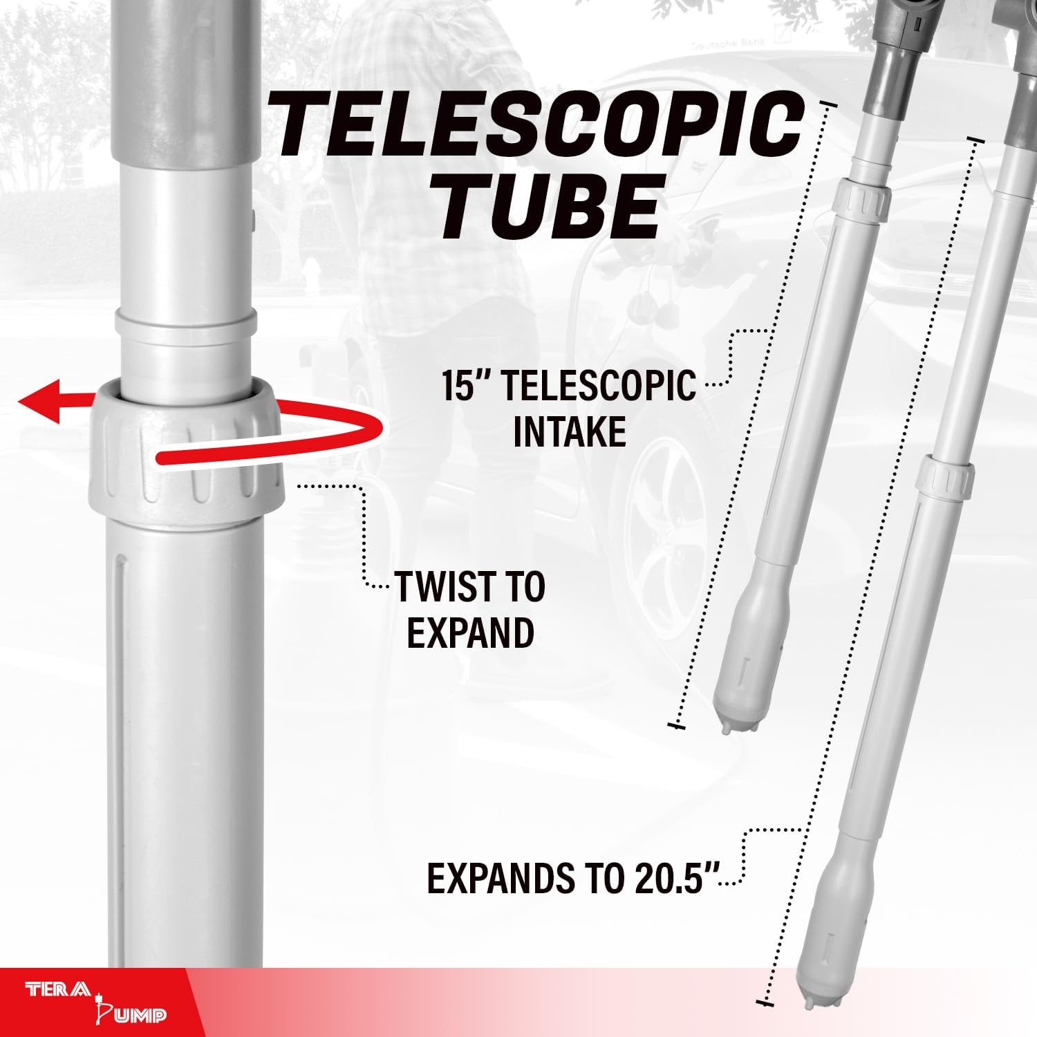 TERA PUMP Fuel Transfer Pump w/Flow Control Nozzle & Telescopic Tube - 3X Powerful D Battery Powered, 10FT XL Long Vinyl Discharge Hose, Multipurpose Portable Battery Pump For Gas, Diesel (2.3 GPM)