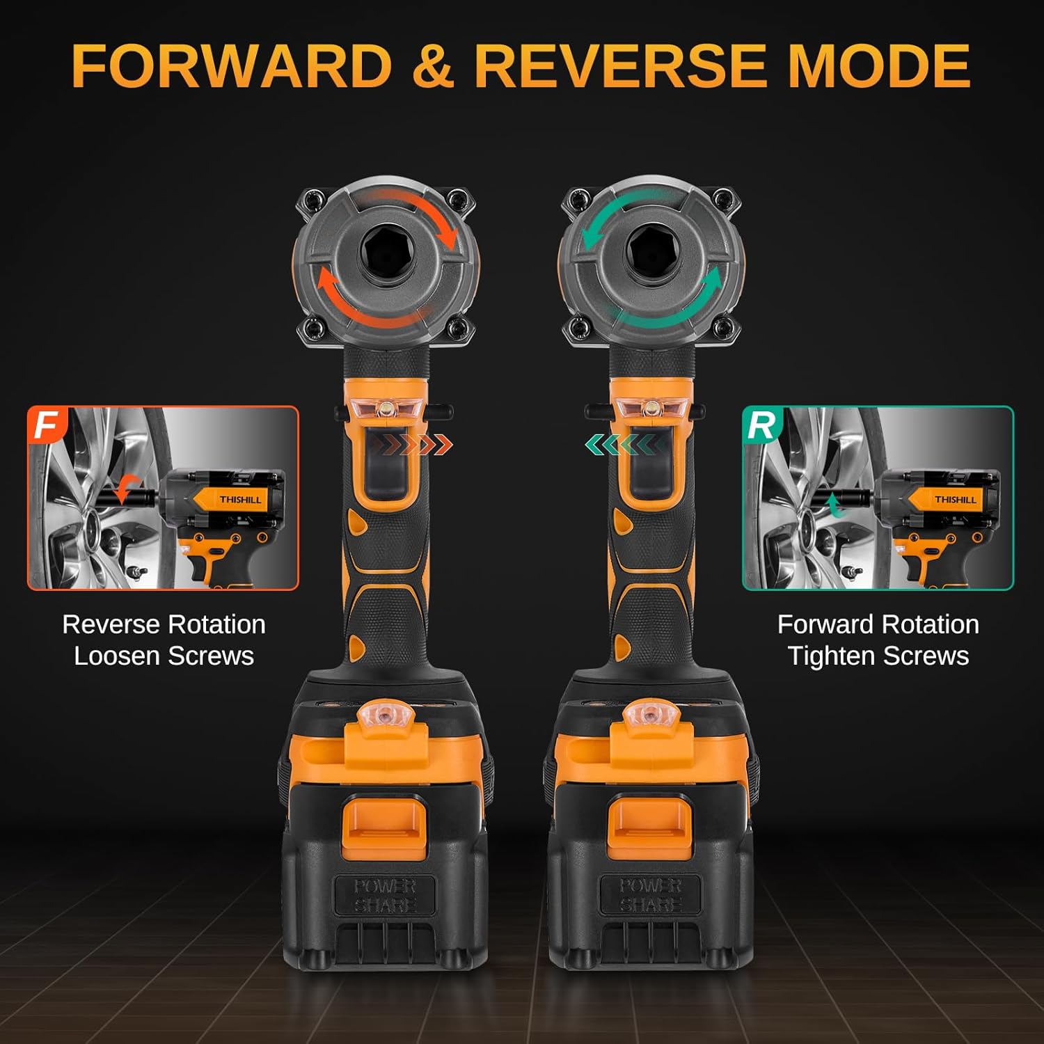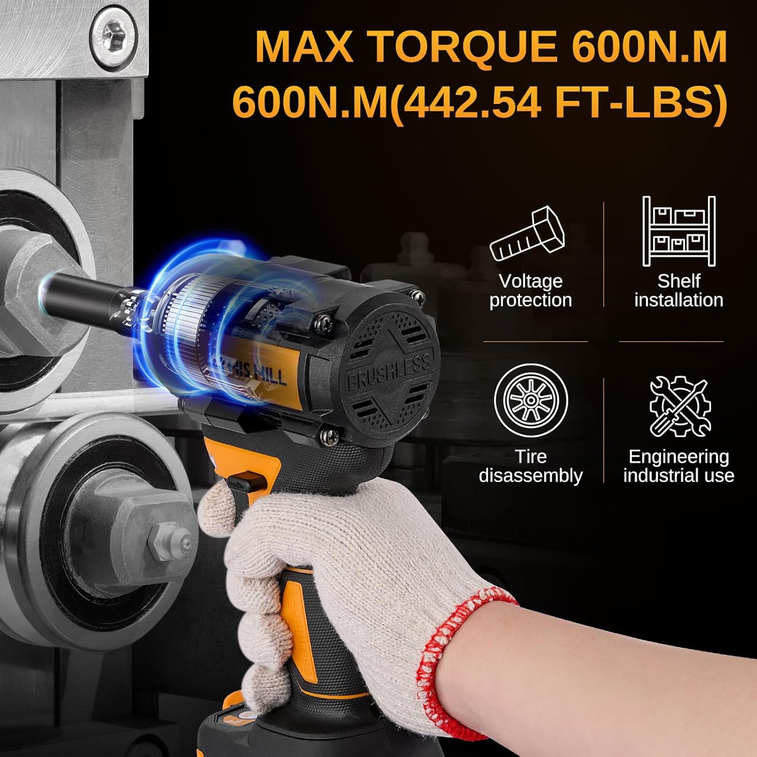This Hill 45PCS Cordless Impact Wrench,600Nm(443Ft-lbs),1/2 Inch Brushless lmpact Driver Set,w/Two 4.0Ah Battery,17 Sockets,High Torque Power Impact Gun for Car Home
