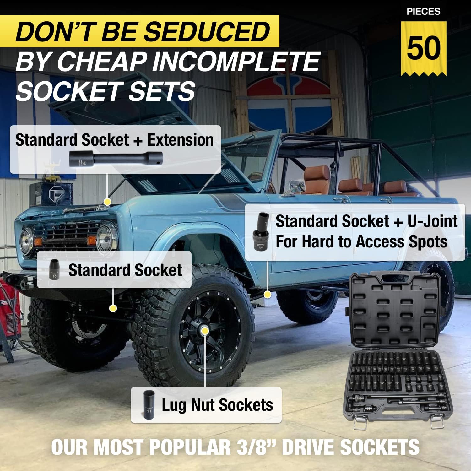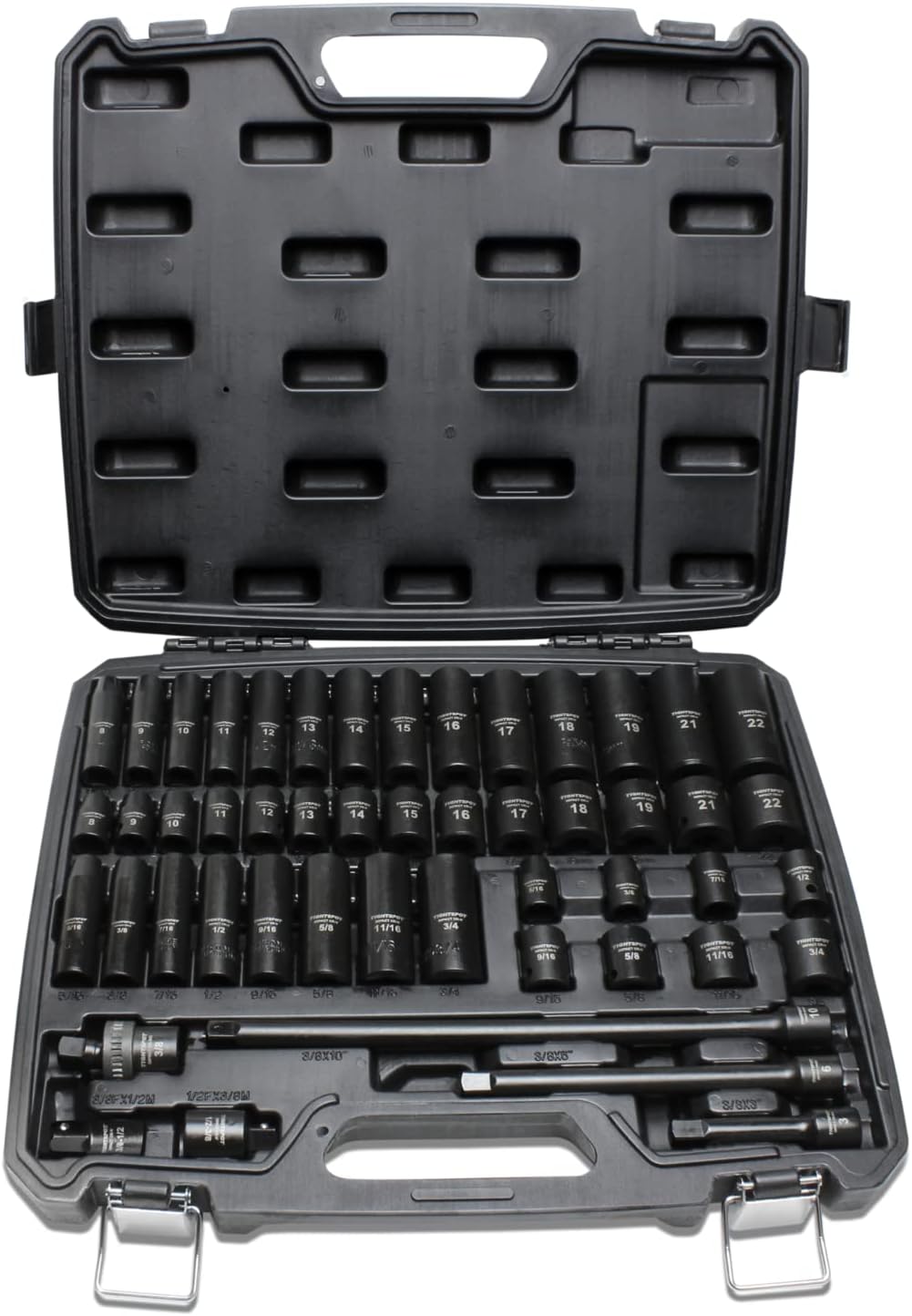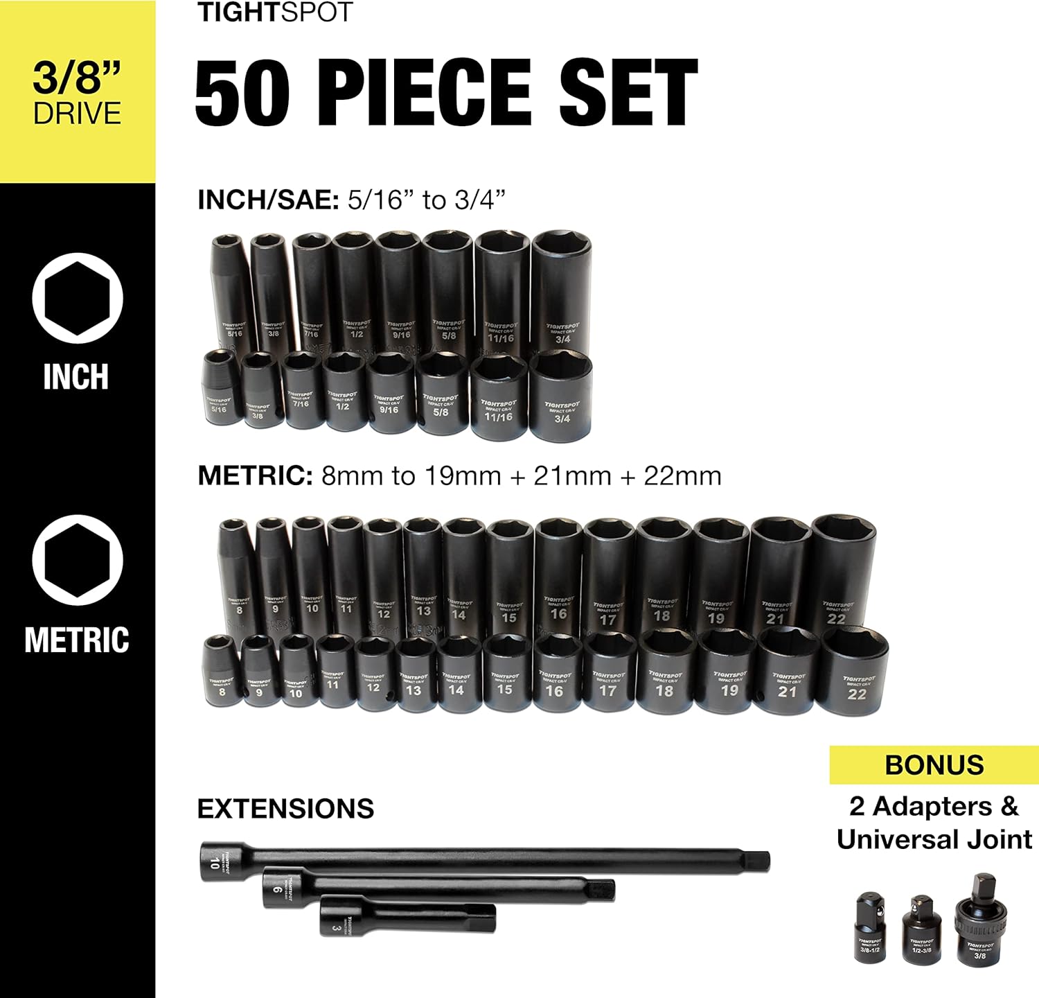 TIGHTSPOT 3/8" Drive 50pc Impact Socket PRO SET, our Most Popular Set Ever with SAE & Metric from 5/16 Inch - 3/4 Inch, 8mm-19mm + 21mm + 22mm, Standard/Deep Sockets, Extension Bars, Adapters & More