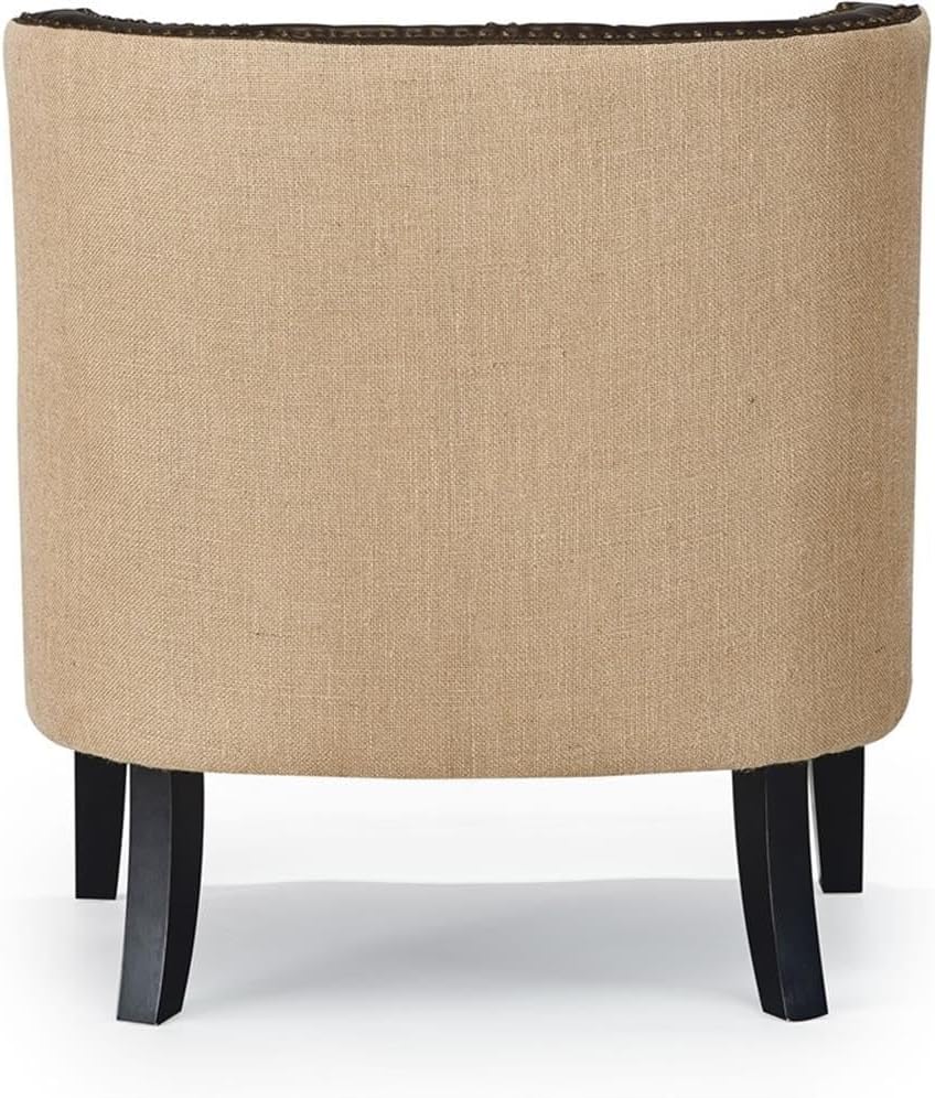 The distinguished charm of this attractive leather Club chair will envelop you in both style and comfort. Brown faux leather and tan natural fiber burlap combine in a stunning traditional style for a timeless look you'll love. Brass nail head trim is hammered by hand for a unique, artisanal touch. The low sloped armless design fits seamlessly into most décor schemes. The high quality channel tufted Back offers plenty of comfort and support. Pair this Brown accent chair with your favorite ottoman and cozy up with a good book. Removable cushion cover for easy cleanup.