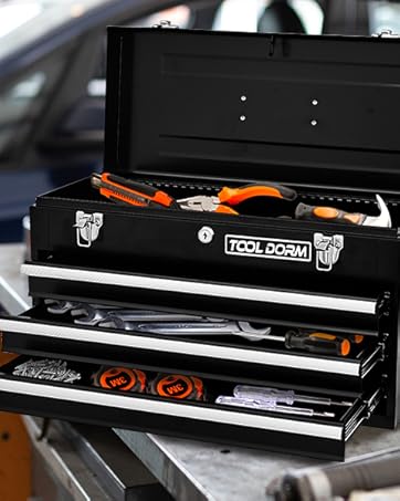 Tool Cart with 2 Drawers and Lockable Door, Garage Storage Cabinet on Wheels, Black color, EVA Cushion, Industrial Service Utility Tool Cart for Mechanics, Garage, Workshop. The Product dimension is 20inch length * 11.2inch depth * 27.6inch height. It can insert side box on opposite side of Handle.