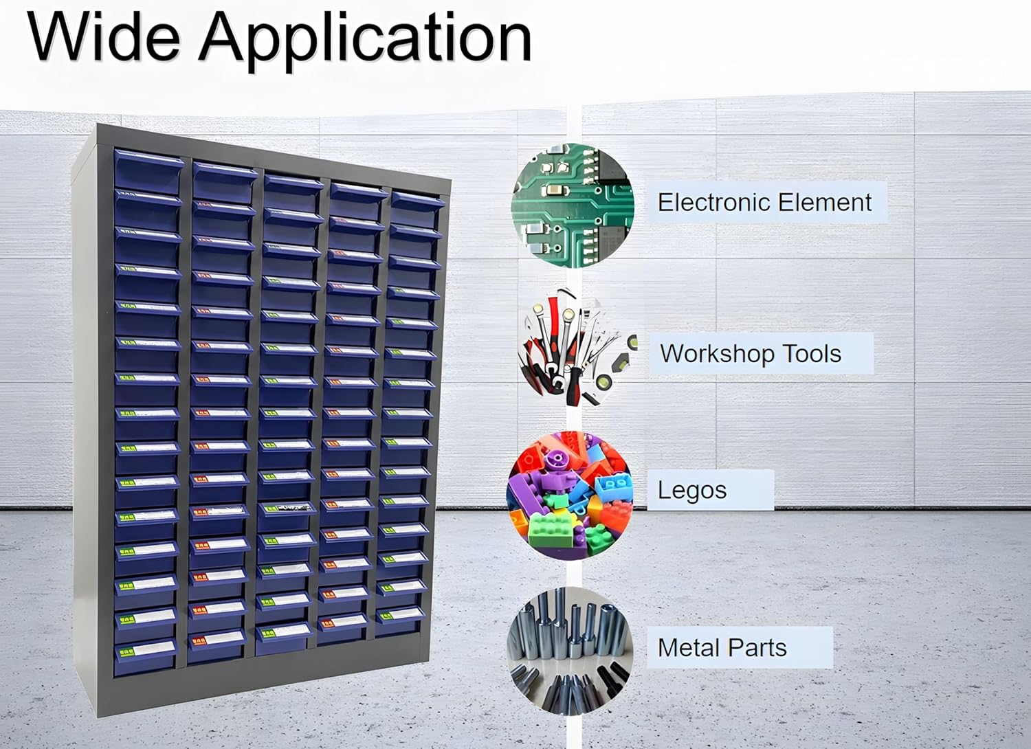 This tool storage cabinet has 75 drawers. It can be used for storing sample, metals, screws, electronic element or other tool parts. Each drawer is equipped with a label card, therefore, you can store and find desired parts conveniently and quickly, also helping distinguish different parts. The drawer size of this cabinet is 7.8''x3.9''x1.9''. If you have the trouble of parts storage, this cabinet is a good choice for you.