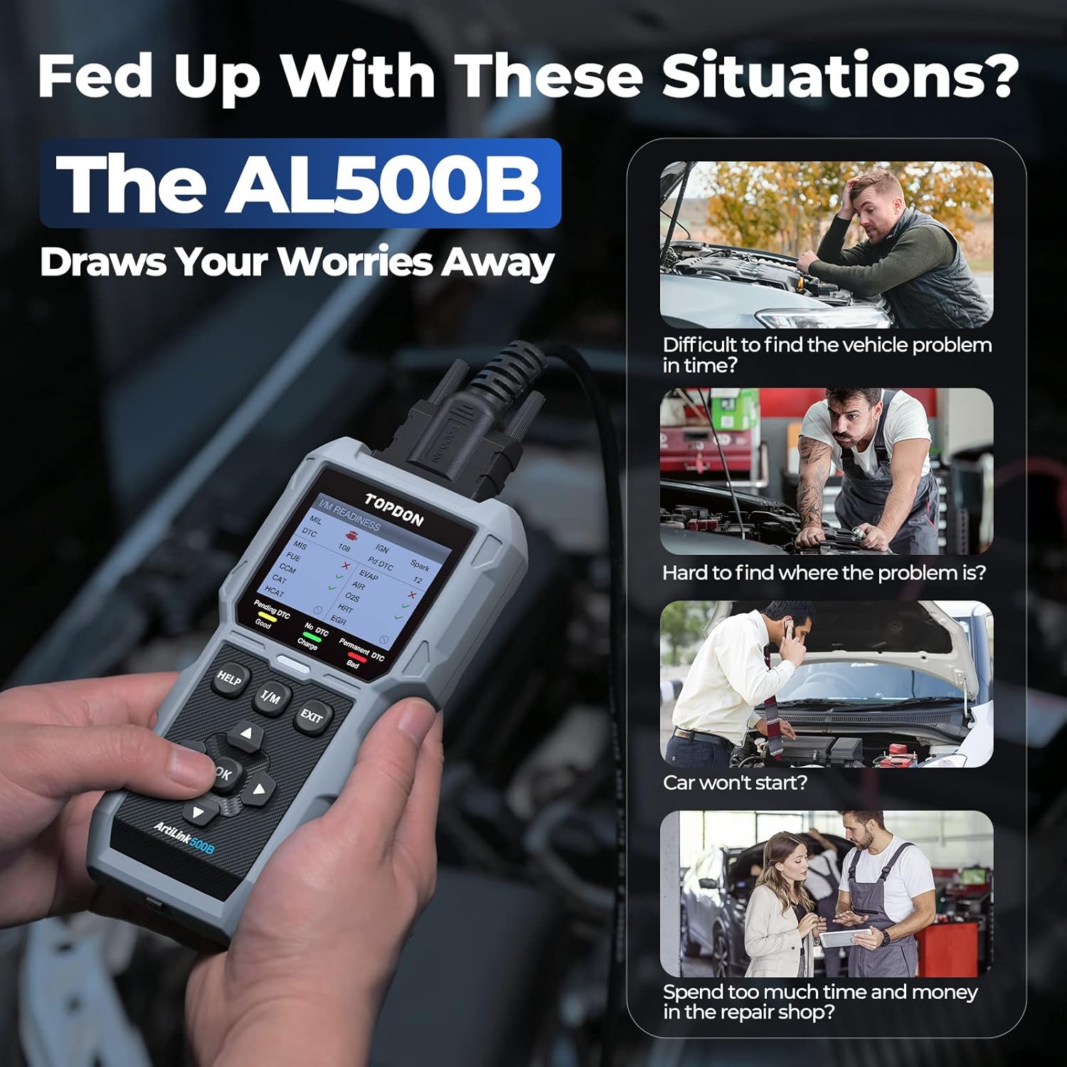 TOPDON AL500B works as an OBDII code reader and performs all 10 modes of OBDII testing on most models released after 1996, allowing you to access crucial information on even more vehicles, supporting full functionalities including reading DTCs, clearing DTCs, Live Data, I/M Readiness Monitor Status, View Freeze Frame Data, O2 Sensor Test, On-board Monitor Test, Evap Test, Read Vehicle Information, and DTC Look Up.