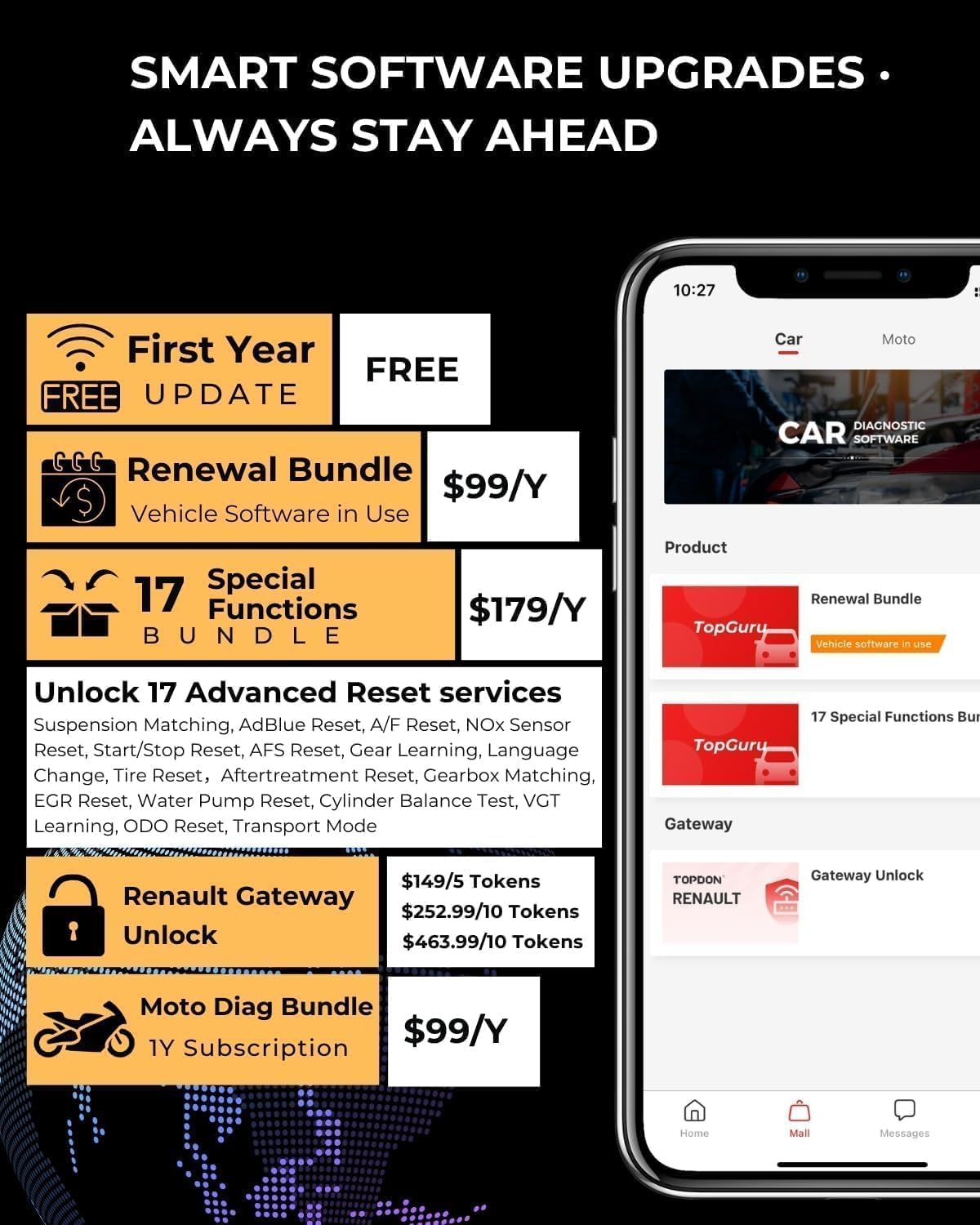 TOPDON TopScan Pro, Wireless OBD2 Scanner Bluetooth for iOS & Android, Diagnostic Scan Tool All System for Car, Bi-Directional Scanner, Code Reader with 13+ Hot Reset Service, FCA AutoAuth