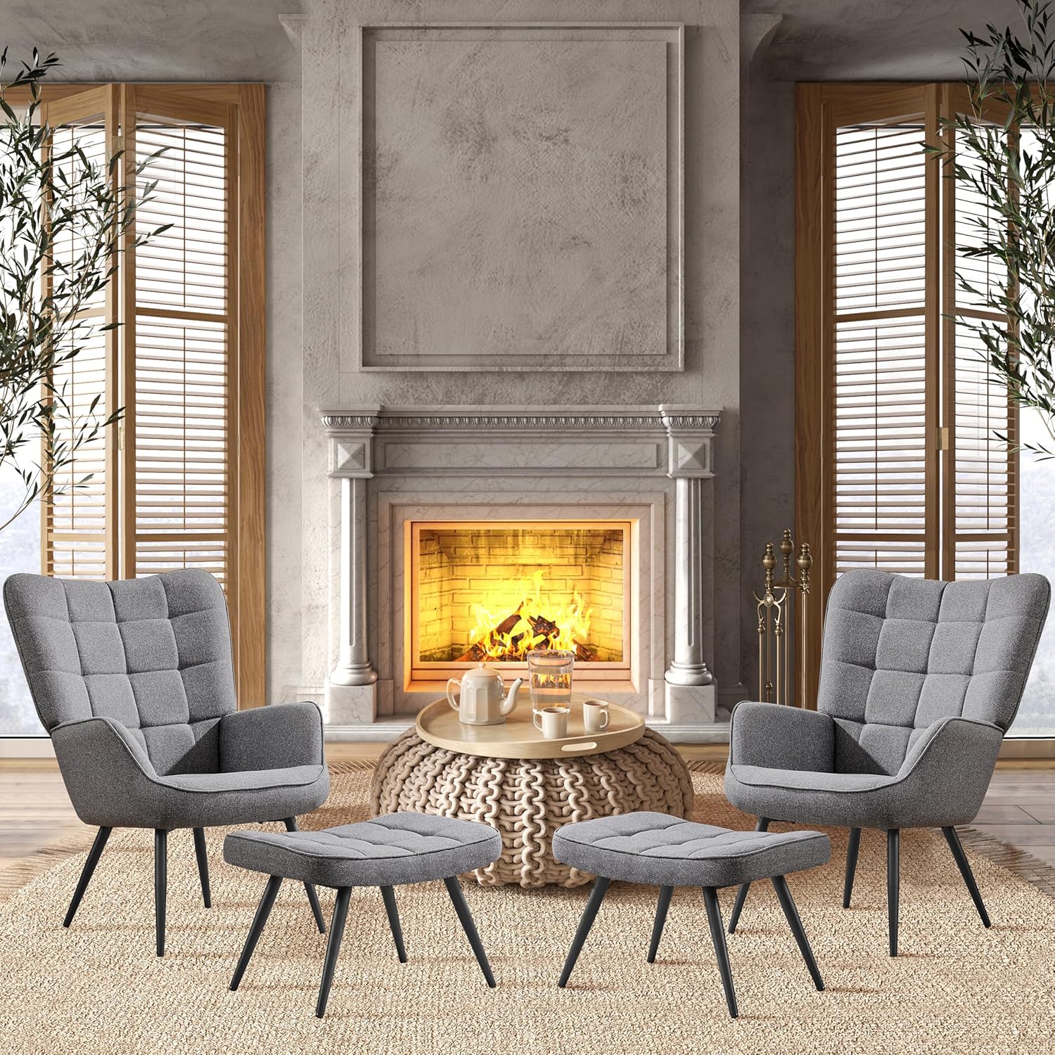 Topeakmart Accent Chair with Ottoman Set, Upholstered Living Room Chair Fabric Arm Chair with Foot Rest Sofa Chair and Ottoman Set for Living Room Bedroom Office, Grey, 2pcs