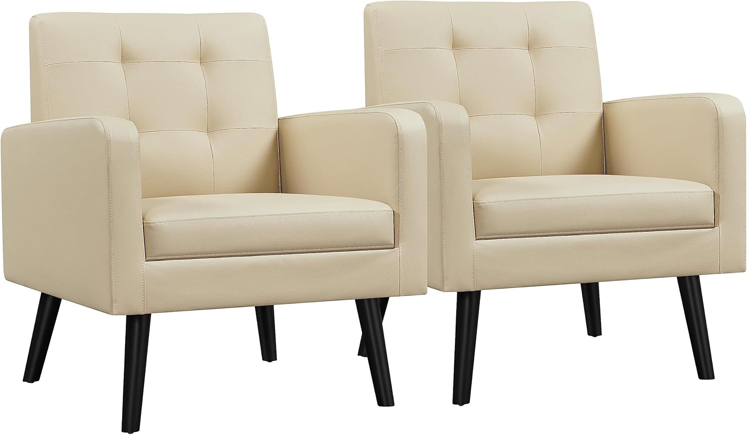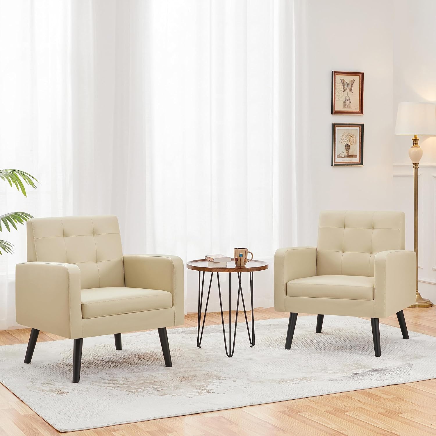 Topeakmart Mid Century Accent Chair, Modern and Cozy PU Leather Barrel Sofa Chair with Thick Cushion and Sturdy Wood Legs for Living Room/Bed Room/Office Waiting Area Beige 2PCS