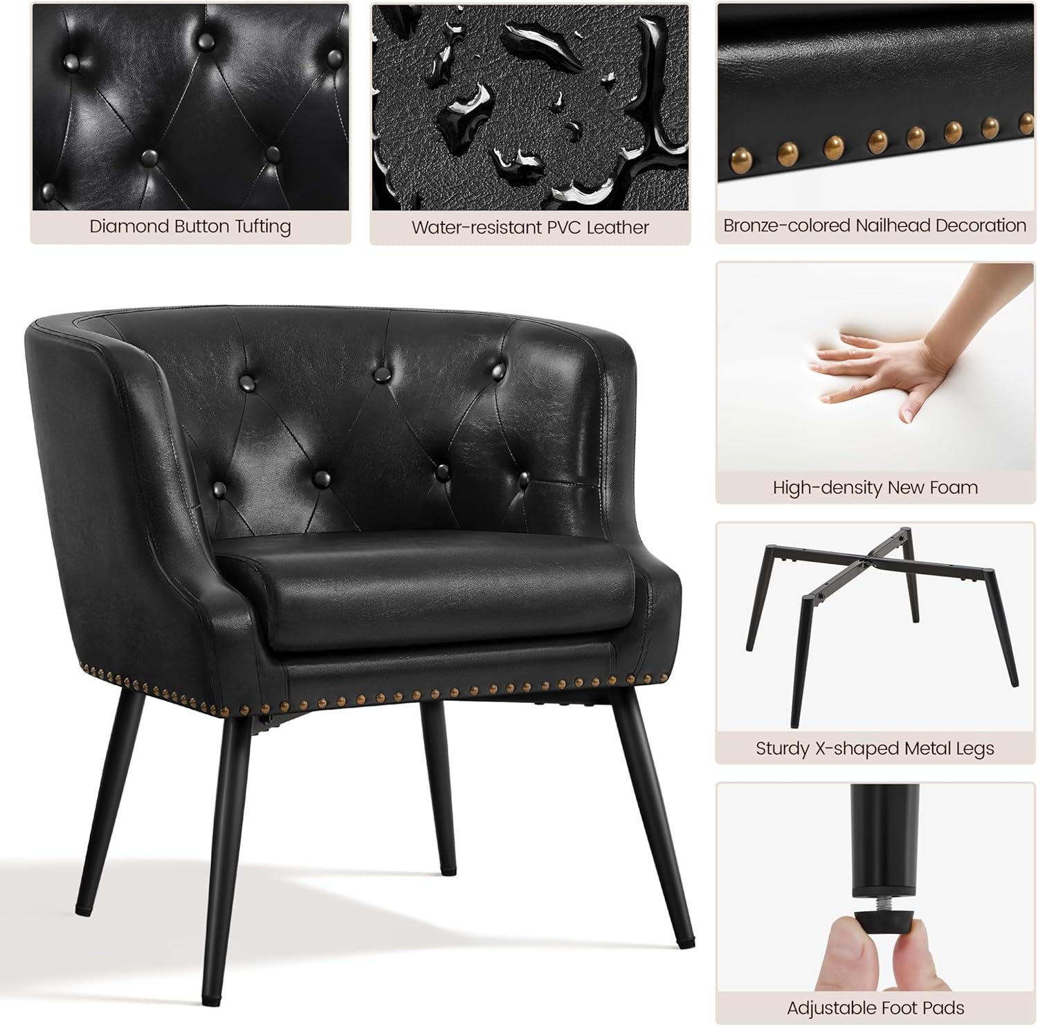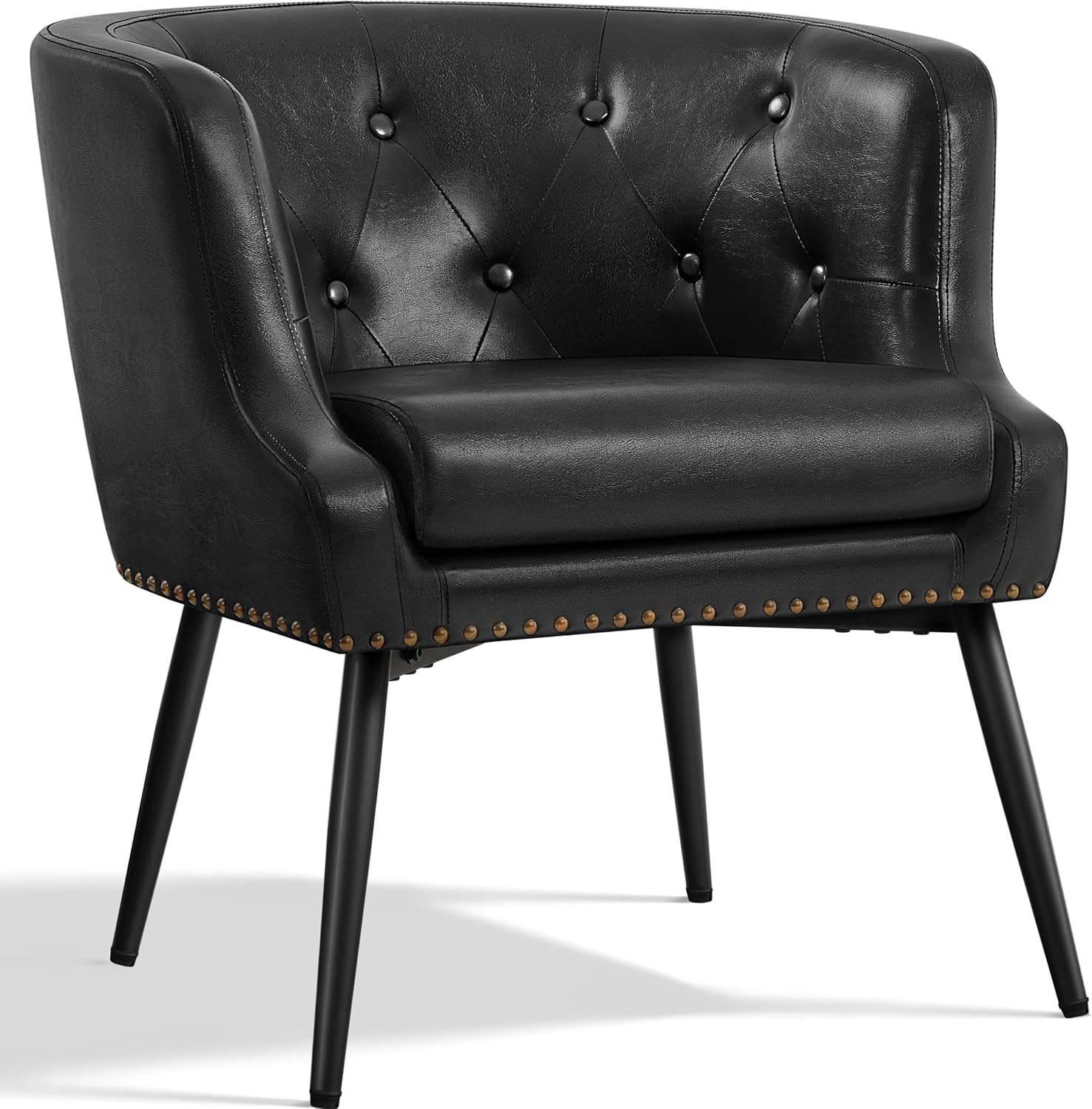 Topeakmart Mid-Century Modern Faux Leather Barrel Chair, Button Tufted Accent Armchair with Metal Leg, Recessed Armrest and Loose Seat Cushion for Living Room Bedroom, Black, 2pcs