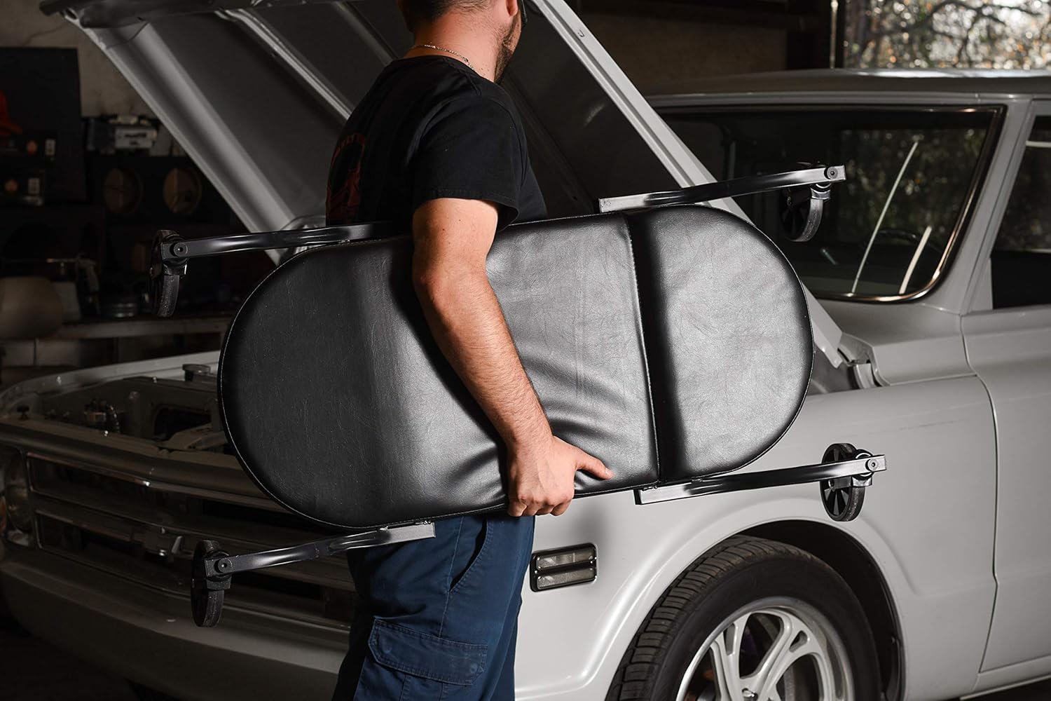 The Original Traxion WideBody Creeper is the ultimate tool for comfort and mobility in your workshop. With its huge 5-inch casters, this creeper glides smoothly over any rough or uneven surfaces, making it the perfect choice for any mechanic who needs to move around their workspace easily and quickly. The outrigger frame provides a low profile, ensuring that you can get to even the tightest spaces with ease. The wide body drop deck is designed to eliminate torso pinch points, ensuring maximum comfort and safety for the user. The contoured deck is extra wide and has built-in lumbar support, providing superior comfort and reducing fatigue, so you can work longer and more productively. The extra padding in the deck ensures that you are comfortable even when working for extended periods of time. The Traxion WideBody Creeper is built to last, with a sturdy construction that can handle the toughest tasks. With its innovative design and superior performance, this creeper is the perfect tool for any professional mechanic. From automotive tools that make the mechanic safer and more productive to truck accessories that improve accessibility, Traxion Engineered Products is dedicated to meeting the needs of its customers, and the WideBody Creeper is a testament to that commitment.