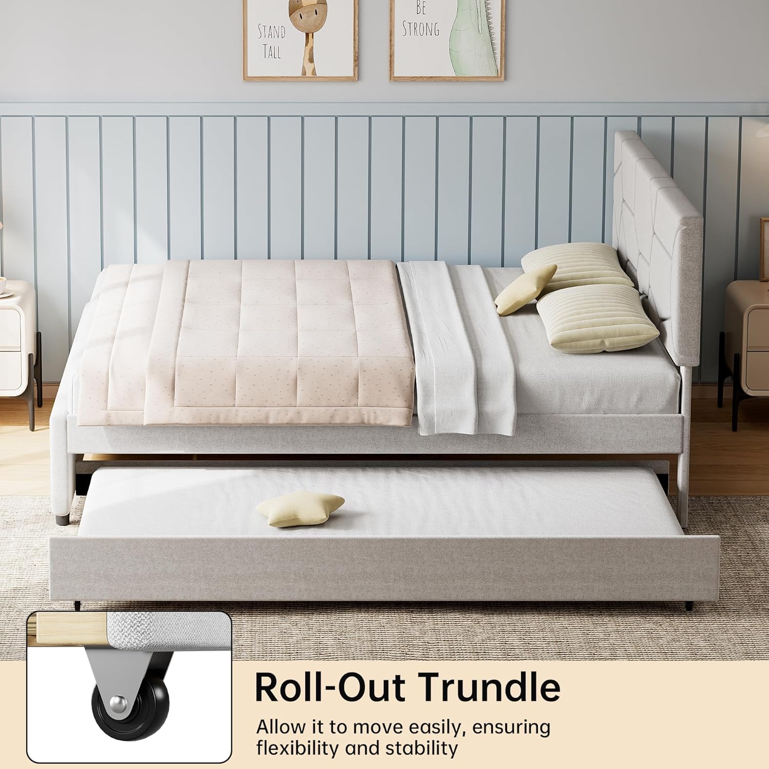 Trundle Bed Twin, Full Size Upholstered Platform Bed Frame, Pull Out Bed with Headboard, Wood Slat Support, for Bedroom, Living Room, Guest Room