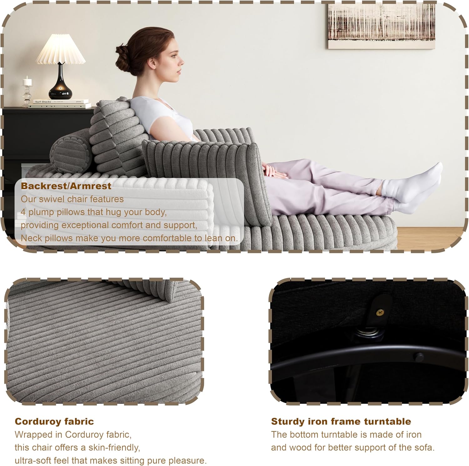 TTK 55” Oversized Corduroy Swivel Chair, Fluffy 360° Rotating Sleeper Armchair with Pillows & Headrest, Full Foam Barrel Chair for Living Room, Bedroom, Reading Nook, Lounge or Apartment,Gray