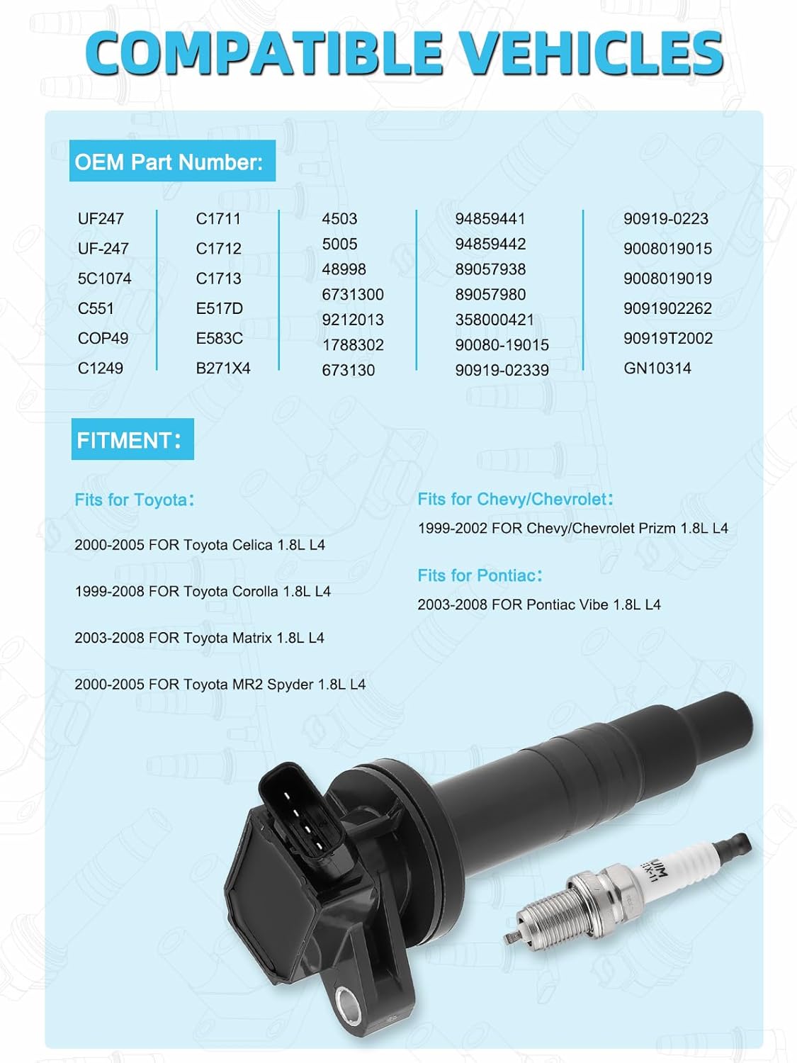 UF247 Ignition Coil 4503 Spark Plug For Toyota Celica 2000-2005,Corolla 1999-2008,Matrix 2003-2008,Mr2 Spyder 2000-2005,For Chevy Prizm 1999-2002,For Pontiac Vibe 2003-2008 1.8L L4,Set Of 4