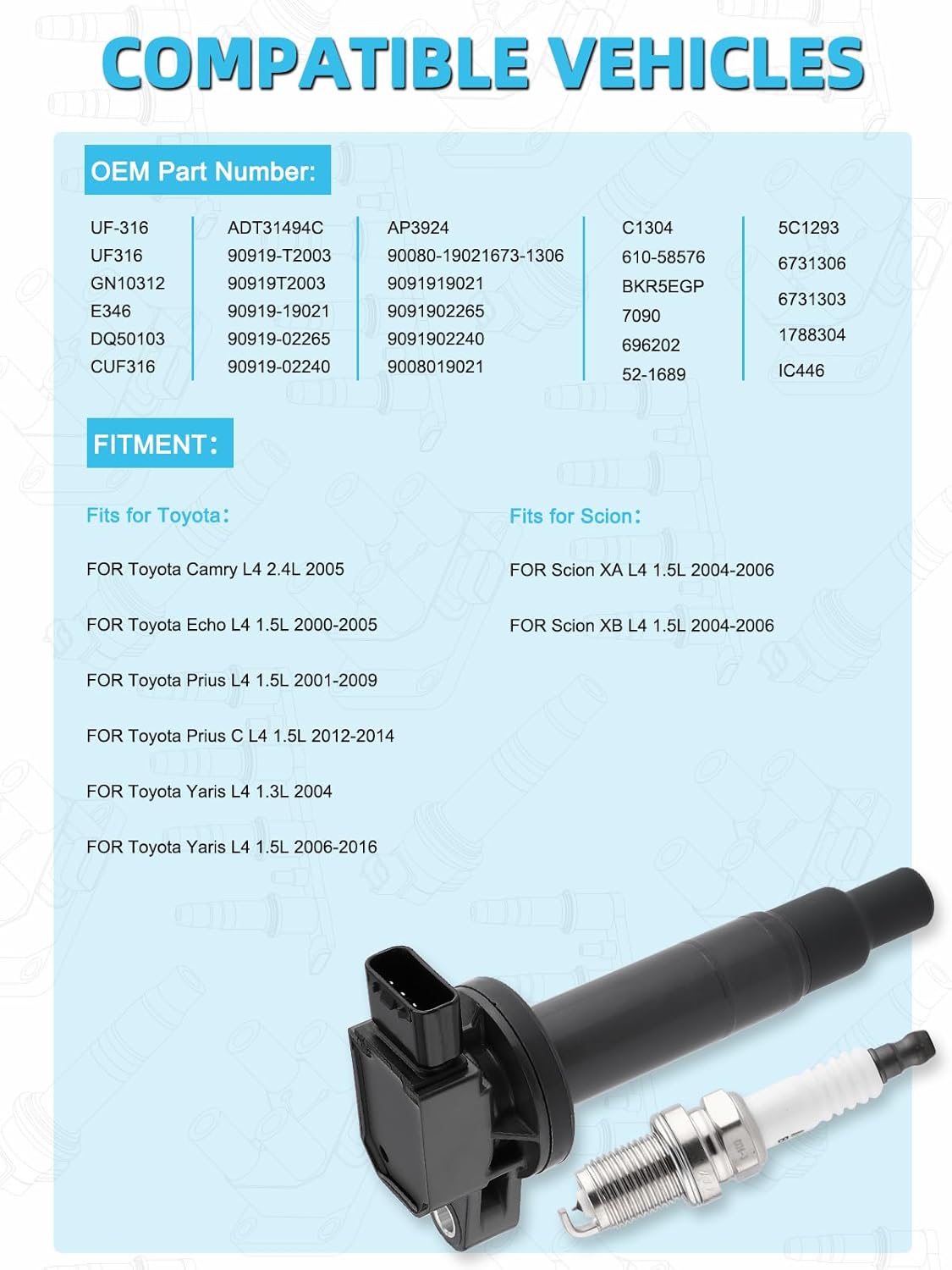 UF316 Ignition Coil Pack Spark Plug 4PCS (1.5L Only) For Toyota Echo 2000-2005,Prius 2001-2009,Prius C 2012-2014,Yaris 2006-2016,For Scion XA XB 2004-2006,Replace # 9091902240 C1304 UF316T 7090